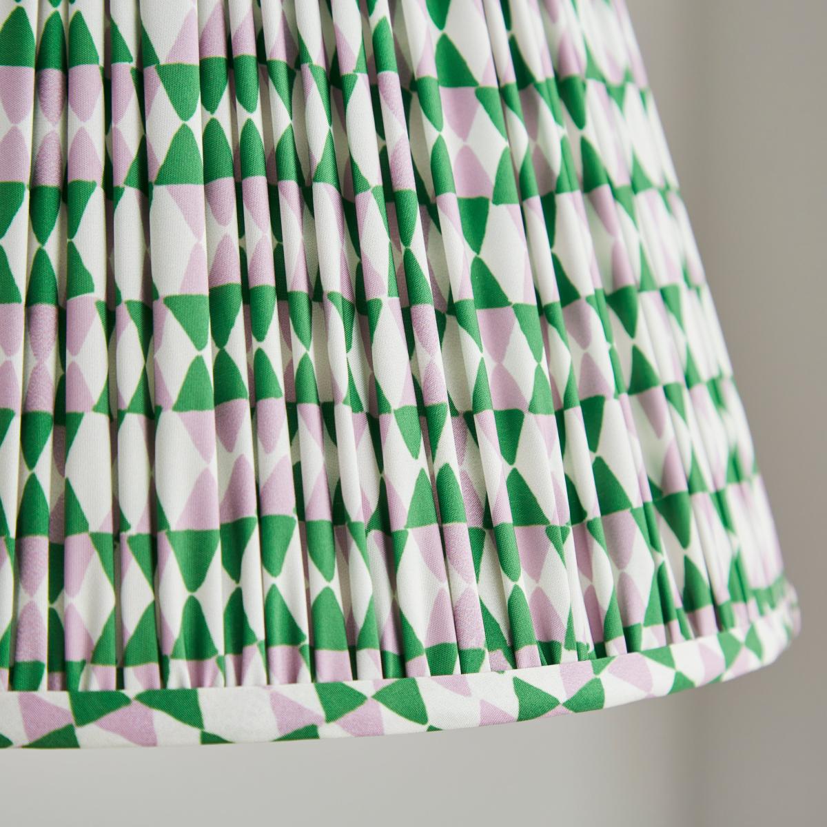 * Geometric Design* Beautiful Green Colourway* Crafted from Polyester* Reversible Gimbal - Suitable for Ceiling, Floor, & Table Lamps Meet the Joyce Conical Green Lamp Shade, which features a stunning pinch pleat design and is crafted from a beautiful polyester fabric. This tapered shade is suitable for use as either a table lamp shade, a floor lamp shade, or a pendant - perfect for complementing a range of modern home décor styles.