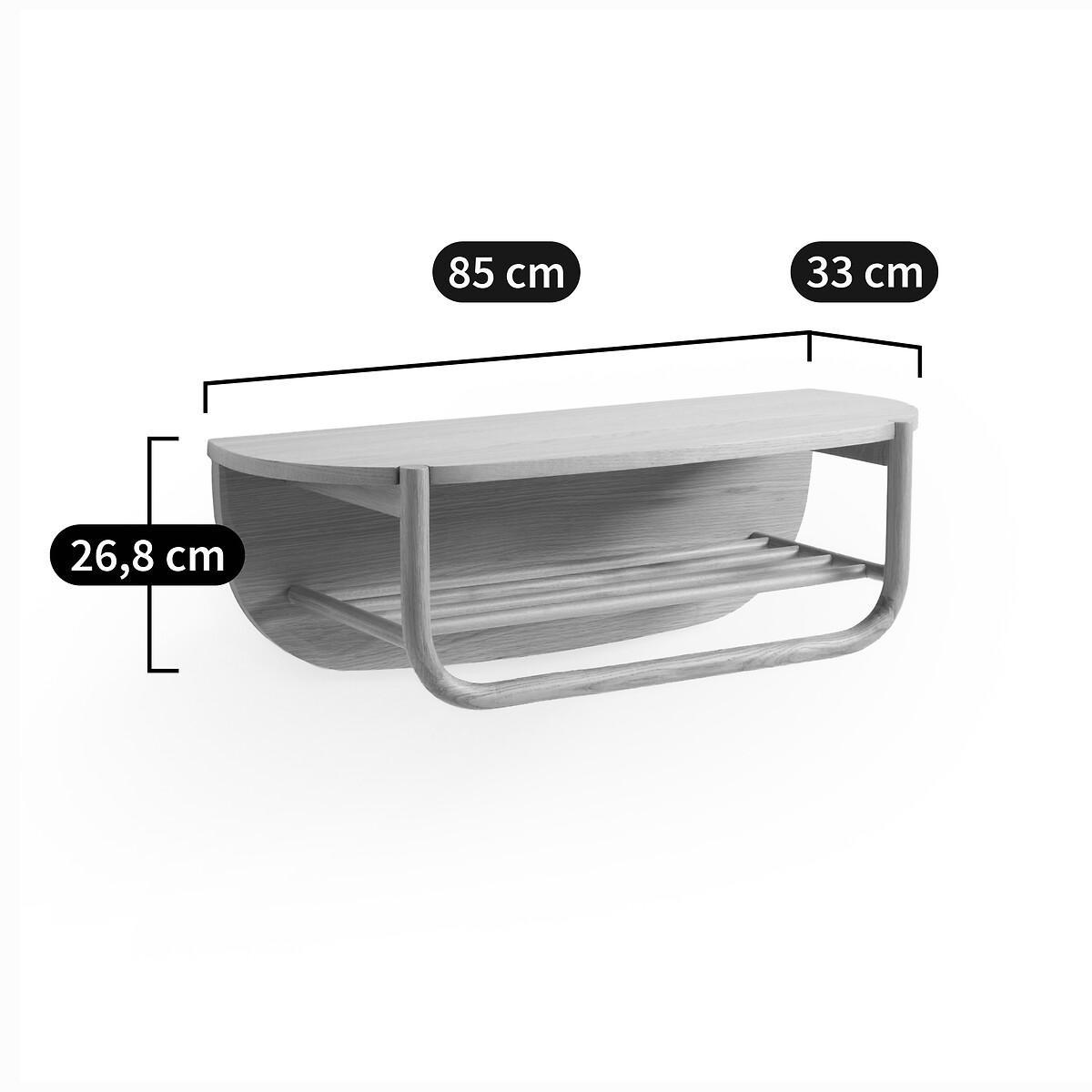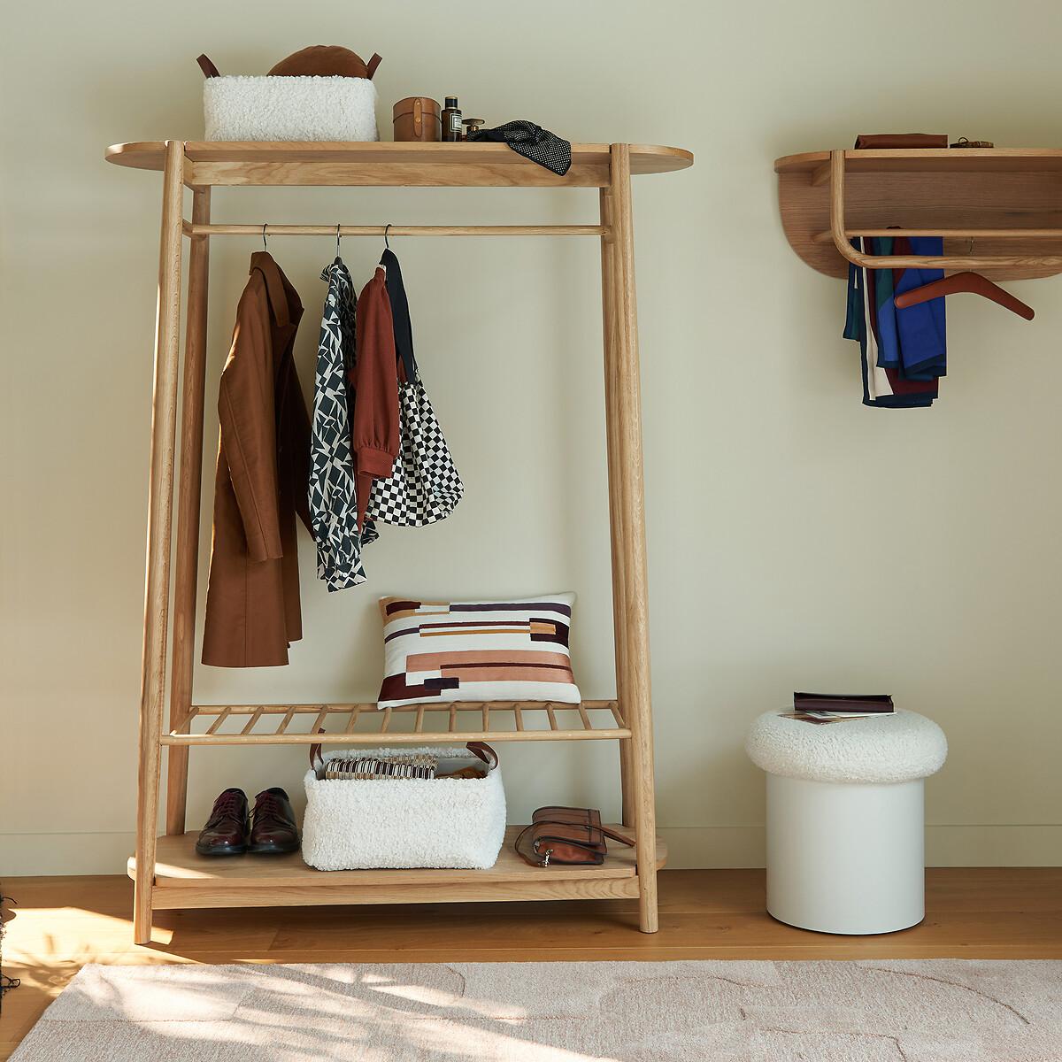 The Jucca oak wall wardrobe shelf. This wall unit has numerous benefits. Smart storage that fits in small and large spaces. A signature design by La Redoute Interiors. Product Details • Wall hanging shelf • 1 oblong shelf in oak veneered MDF, nitrocellulose finish • 1 shelf with bars and 1 wardrobe bar in solid oak, nitrocellulose finish • FSC® certified wood • Wall mounting system included, screws and dowels not provided. Dimensions • Width: 85cm • Height: 26.8cm • Depth: 33cm • Height between rung shelf and top shelf: 15.5cm • Weight: 8.5kgDelivery:. Sold pre-assembled. Available for home delivery. • WOOD FROM SUSTAINABLY MANAGED FORESTS. FSC® certified wood comes from forests that are environmentally, socially and economically well managed. Dimensions and weight of parcel1 parcel • L98 x H34 x D59cm. 13.5kg.