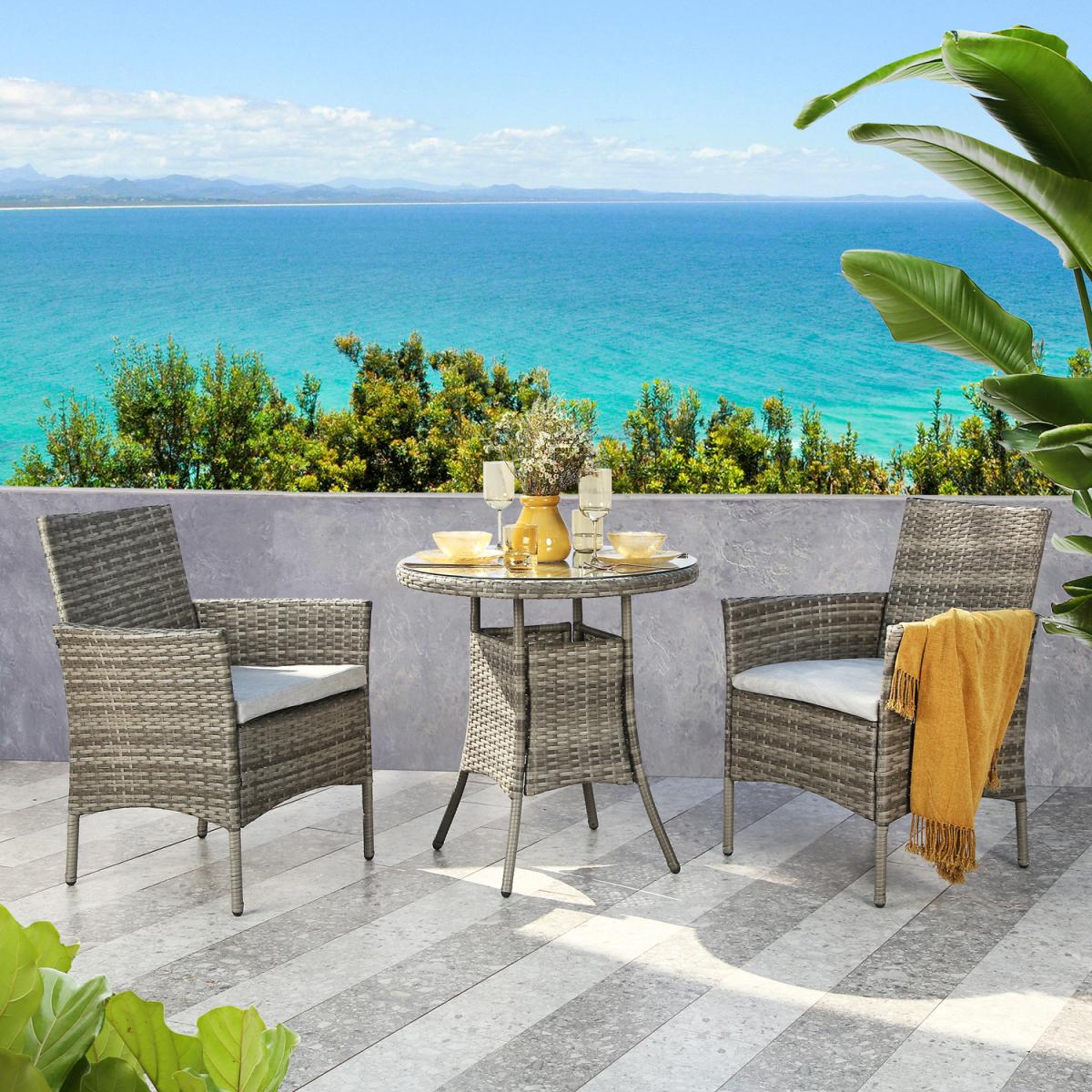 Presenting the Judas bistro set, a classy and cosy rattan bistro set of outdoor furniture ideal for people who want to eat or drink outside. Two dining chairs and a round bistro table are included in this garden bistro set, which are all crafted with premium materials and with your comfort in mind. The Judas bistro set is built to last and withstand the elements of the outdoors. The set's chairs are made with durable rattan that is both lightweight and weather-resistant, ensuring that they can withstand the harsh outdoor elements without fading or deteriorating over time. To ensure durability and resilience to wear and tear, the steel frames of the table and chairs have been powder-coated. This gives the 2 seater rattan bistro set a clean, contemporary appearance as well. The Judas bistro set is made to be simple to assemble and disassemble. Also, it is simple to stow and move around as needed due to its small size and lightweight. This rattan bistro set for 2 is ideal for individuals who want to buy many sets for bigger gatherings or events. The Judas bistro set is an attractive, long-lasting, and comfortable outdoor furniture set that offers you and your visitors good sitting.