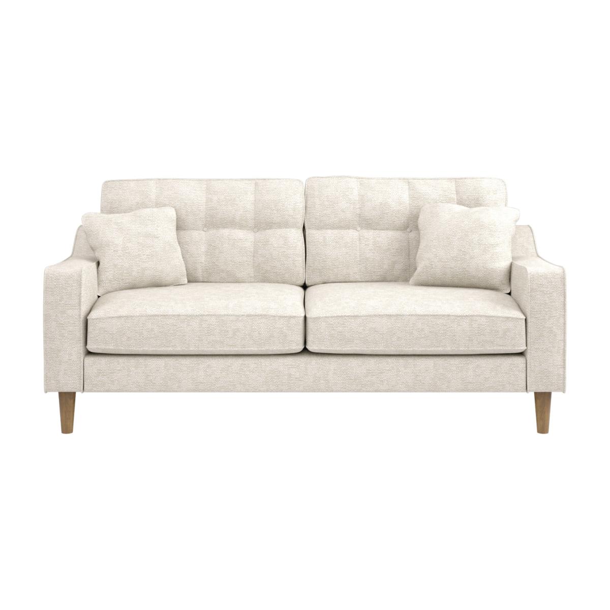 The Solace Co Jude 3 Seater Midcentury Beige Fabric Sofa is a stylish blend of retro aesthetics and contemporary comfort, making it a perfect centrepiece for any living room. Embracing a mid-century design, this sofa features elegant button detailing on the back cushions and sides, giving it a timeless appeal thats both sophisticated and inviting. Upholstered in soft beige fabric, the Jude sofa is versatile enough to complement a variety of interior styles, while its foam-filled seat and back cushions provide exceptional comfort and support. The sofa comes complete with scatter cushions, adding an extra layer of luxury and enhancing its cosy, inviting feel. Setting up the Jude is effortlesssimply attach the feet, and its ready to elevate your space. With its compact yet spacious design, it offers ample seating for three, making it ideal for family rooms, living spaces, or even office settings.