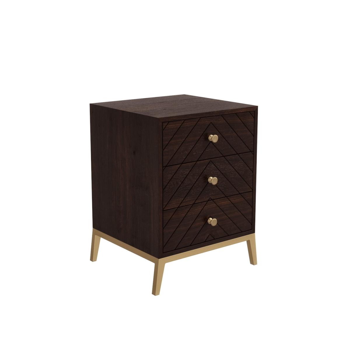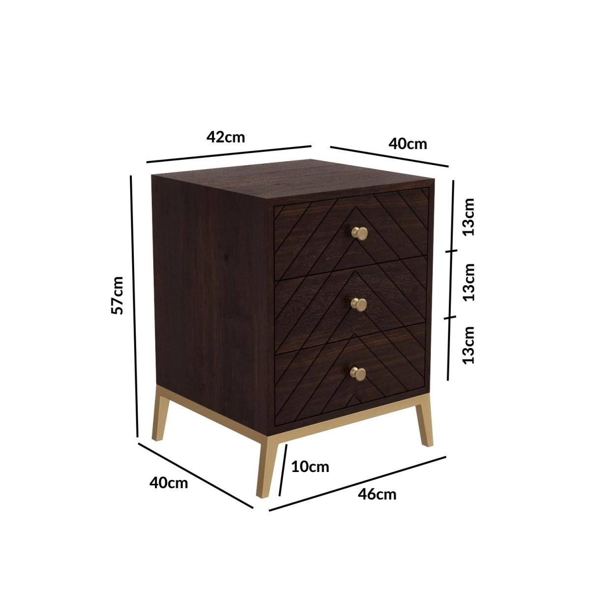 Features we love Expertly handcrafted by skilled artisans each piece offers its own charm and characteristics. There may be natural variations in colour and texture making each piece truly unique to you. The distinctive chevron design on the drawers add an instant style fix to any interior. The brass-finished drawer handles and legs work brilliantly with the contrasting dark wooden tones. Three spacious drawers provide plenty of space to keep your bedside essentials. Crafted from chunky mango wood it's strong sturdy and built to last. With no assembly required you can enjoy this piece right away! All about me. Give your bedroom an instant uplift with this beautiful art-deco inspired chest of drawers table. It oozes effortless style with its eye-catching chevron drawer fronts and contrasting brass touches. Hand-finished and crafted from solid mango wood with a dark warm tone the chest of drawers keeps things subtle and sophisticated ideal for both modern and more traditional styles. The three drawers are constructed with smooth wooden runners for added durability and provide plenty of space to store your clothes neatly away. Plus the angled metal legs are coated with a brass finish which really brings the whole piece together. Need to know. Overall dimensions. H54 x W46 x D40 cm Drawer dimensions. H14 x W39 cm Material. Solid mango wood MDF Brass and Iron Drawers. 3 Finish. Dark Wood Assembly required. No.