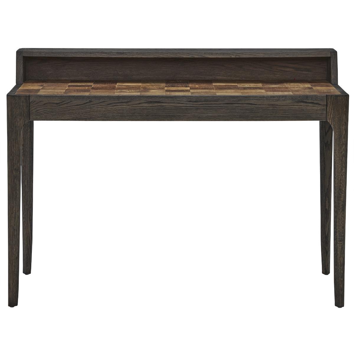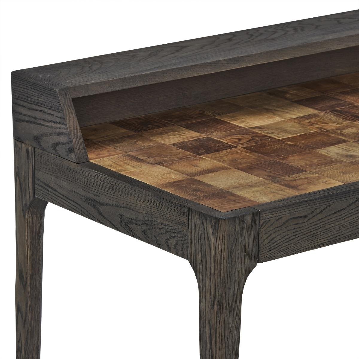 Design. The Jude Desk has an old school feel to it, with its slim legs leading up to a desktop which has a vintage shape and style. The dark weathered oak compliments and highlights the top of the Jude Desk which displays a checkerboard pattern crafted from natural old pine. This traditional piece will be the main attraction in your home office.