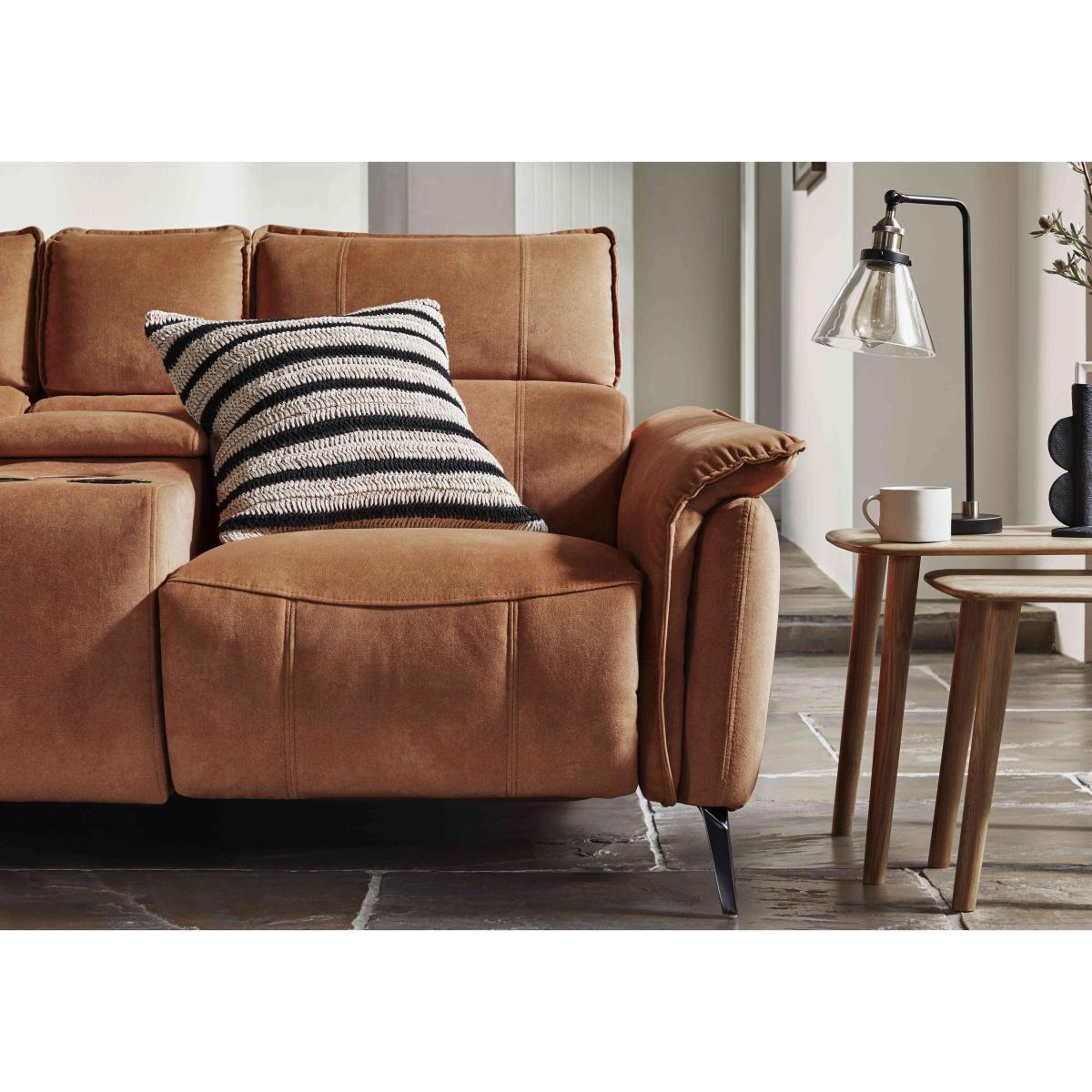 With its clean-lined contemporary look and outstanding pocket sprung seats, the Jude range strikes the perfect balance between style and comfort. This handcrafted collection includes sofas, armchairs and storage footstools and offers easy ways to find your way to perfect and personalised comfort thanks to the power recliner and telescopic headrest sofa and armchair options. Showcasing understated yet elegant metal legs in an on-trend gunmetal grey finish, pieces are upholstered in your choice of sumptuous 100% leather or high-quality fabric in a selection of colours. The Jude range is exclusively available at Furniture Village. This sofa simply makes life more comfortable thanks to its power recliners, power telescopic headrests, sprung seats and, especially, that clever console unit with cooling cup holders. Why you'll love it You’ll love the smart console unit that’s built into this fabric power recliner sofa. Relaxed contemporary style. Power recliners and power telescopic headrests for head-to-toe comfort. Smart console unit has wireless charging, cooling cup holders and a storage space. Built-in USB and USB-C charging for the ultimate in convenience. Supportive pocket sprung seats and superb lumbar and arm cushioning. Upholstered in high-quality fabric in a choice of colours. Also available with 100% leather upholstery. Slender metal legs have a gunmetal grey finish. Handmade exclusively for Furniture Village. This 3-seater fabric power recliner sofa with smart console unit is part of the Jude range. What you need to know Medium comfort level. Seat suspension: sinuous spring. Seat cushioning: pocket spring, foam and fibre. Cushioning is fixed. Back suspension: webbing. Back cushioning: fibre. Cushioning is fixed. Feet are removable. Please allow time for the recliner mechanism to ease. Minor gaps are necessary to ensure ease of motion and may be exaggerated depending on floor type. Fixed seat and back cushions require smoothing and straightening regularly. To smooth and straighten fixed cushions, punch the back cushion’s top two corners and the seat cushion’s outer two corners, and pinch outwards. Flattening and shading of heavy wear areas on pile fabrics is unavoidable. Clean regularly using a soft brush or vacuum with the curtain attachment. Deal with any spills promptly. Professional cleaning advised for oil- and grease-based stains. Please read our upholstery care guide for more advice. Item code: JUDE3PCUFAB-001