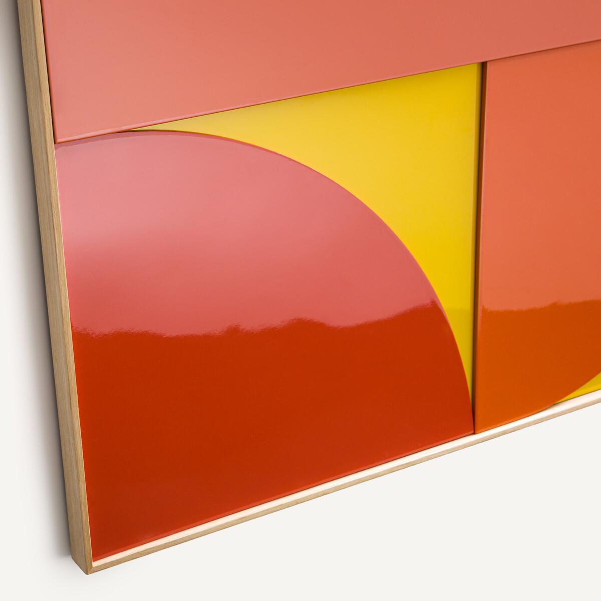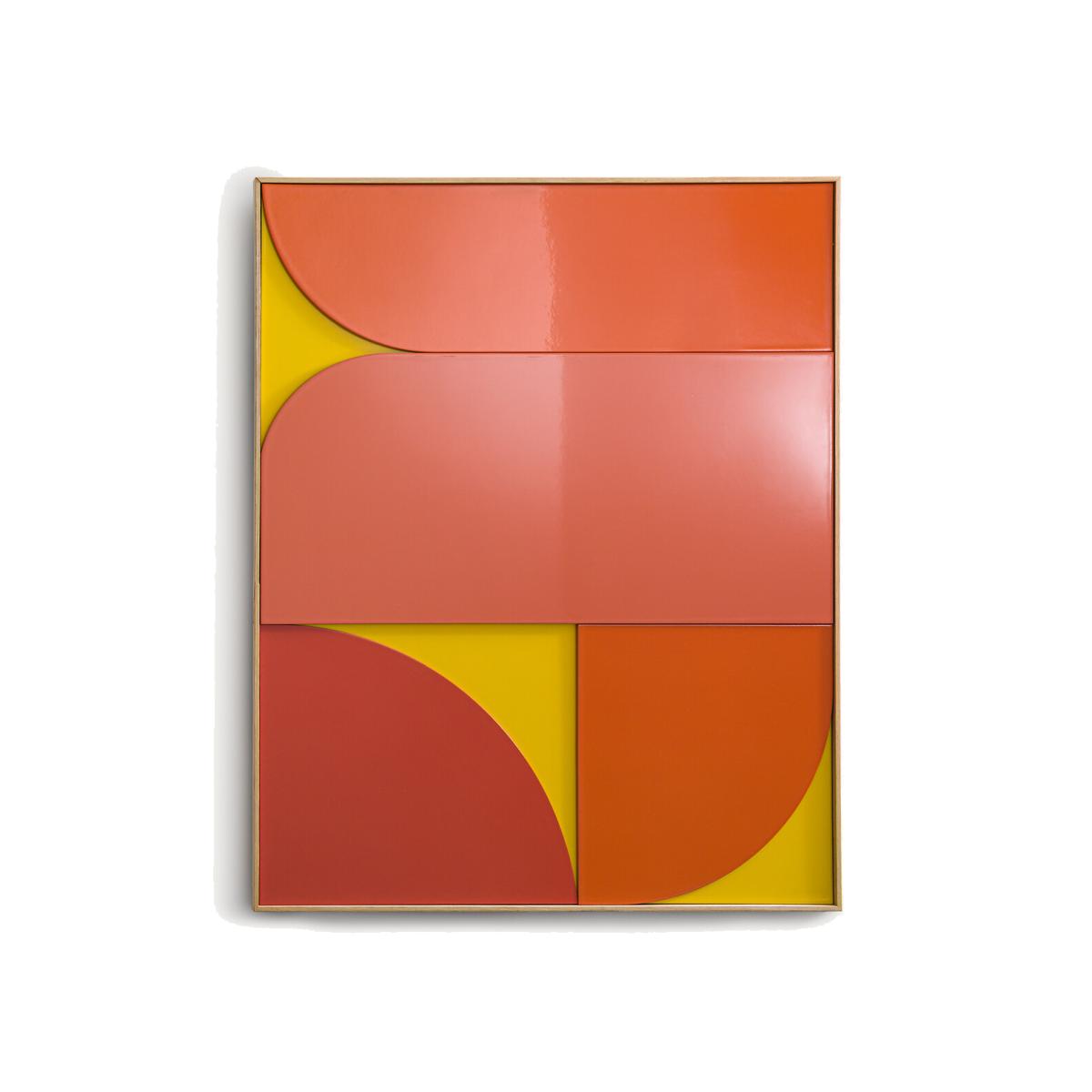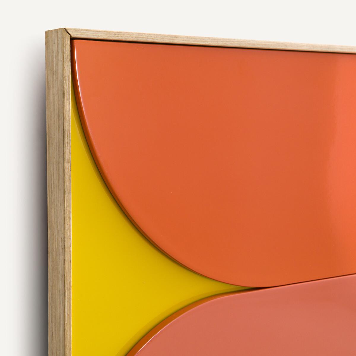Sunny and vibrant, this wall decoration bursts with bright, optimistic colours, intensified by the brilliance of its paint. Abstract forms create a lively, graphic painting. It's an invitation to travel. Product Details • Sparkly paint finish on MDF • Oak frame • FSC® certified wood • Hand painted: Each piece is unique • Plates for wall hanging (screws and plugs not provided)Dimensions • Width: 80cm • Height: 100cm • Thickness: 2cm • WOOD FROM SUSTAINABLY MANAGED FORESTS. FSC® certified wood comes from forests that are environmentally, socially and economically well managed. Dimensions and weight of parcel • 1 parcel • W106 x H9.5 x D86cm. 10.5kg