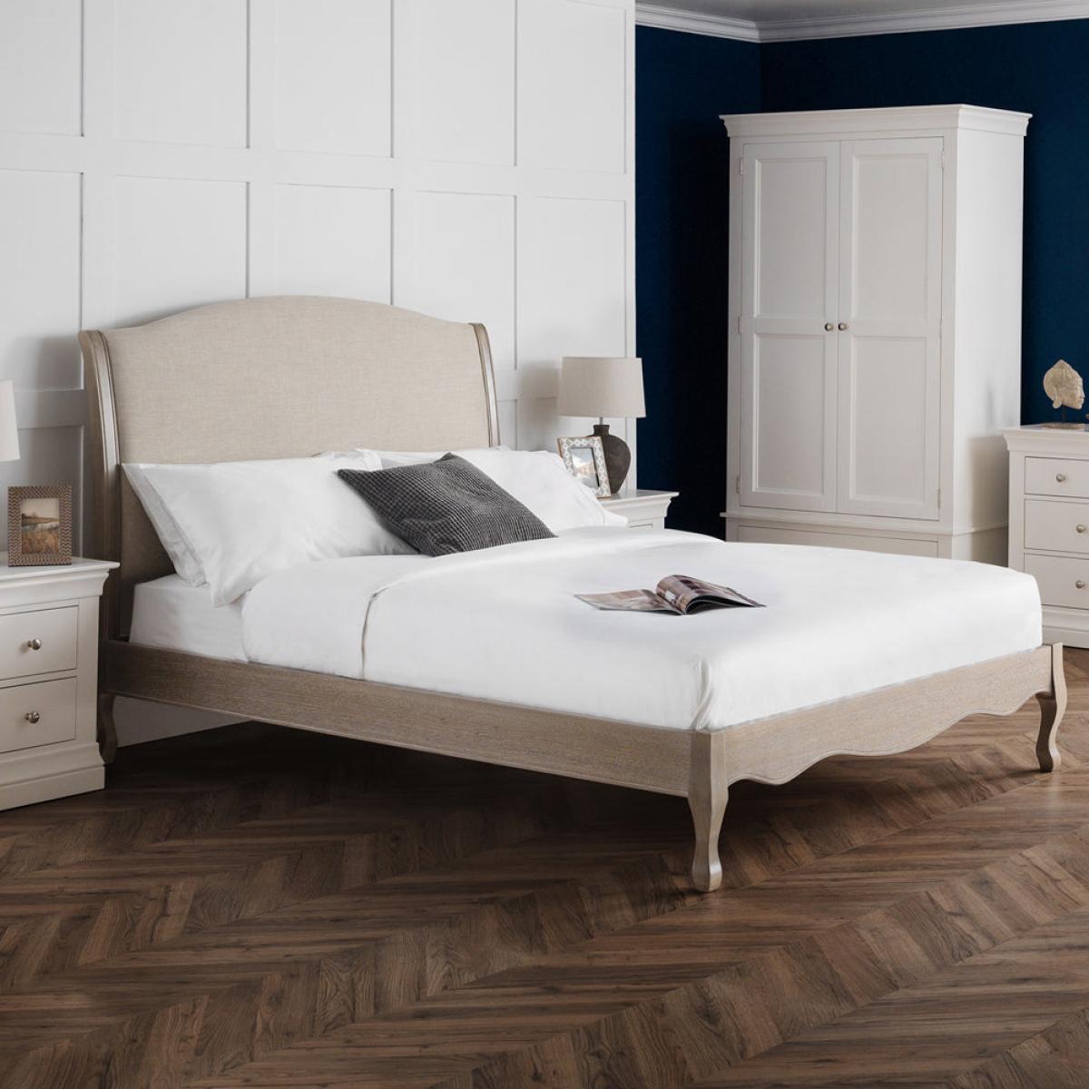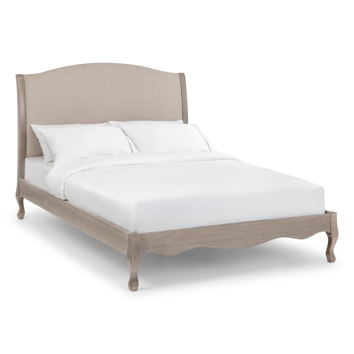 Inspired from a classic French design, the Camille bed excels in elegance. Featuring traditional ornate details, from the curved and arched headboard, to a scalloped footboard with cabriole legs, this bed is the definition of a timeless design. The frame is finished in a limed oak effect, with a soft upholstered headboard covered in an oatmeal linen fabric. The Camille Bed is available in 135cm Double, 150cm King, and 180cm super king sizes. Materials: Rubberwood, Mdf & Linen Fabric. Assembly Required: Yes. Care Instructions: Wipe with a clean damp cloth. Avoid household cleaners & abrasives.