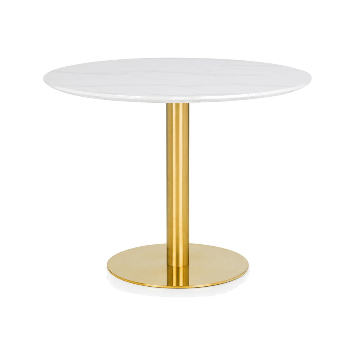 The Palermo round pedestal table is a contemporary, modern, and sleek piece which will complete your dining experience. With an easy-to-wipe, crisp marble top and sturdy gold base, it oozes sophistication whilst being functional and classic. Whether you’re having drinks with a friend, or a relaxed lunch with your loved ones, the Palermo is a beautiful addition to any home. Materials: Vinyl Wrapped Mdf & Metal. Assembly Required: Yes. Care Instructions: Wipe with a clean damp cloth. Avoid household cleaners & abrasives.