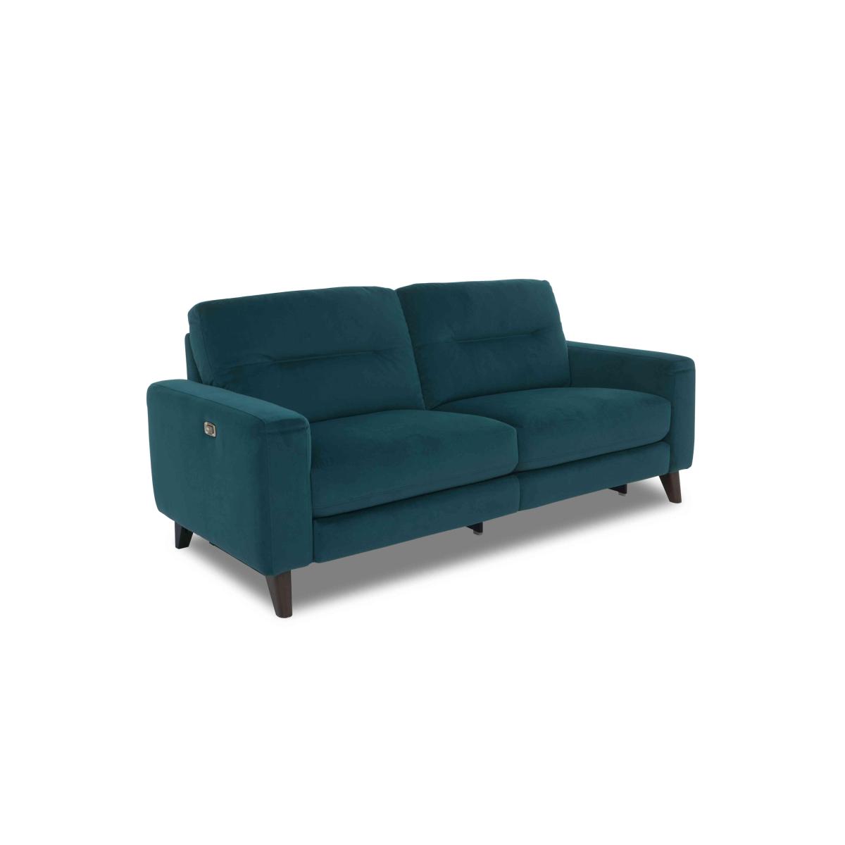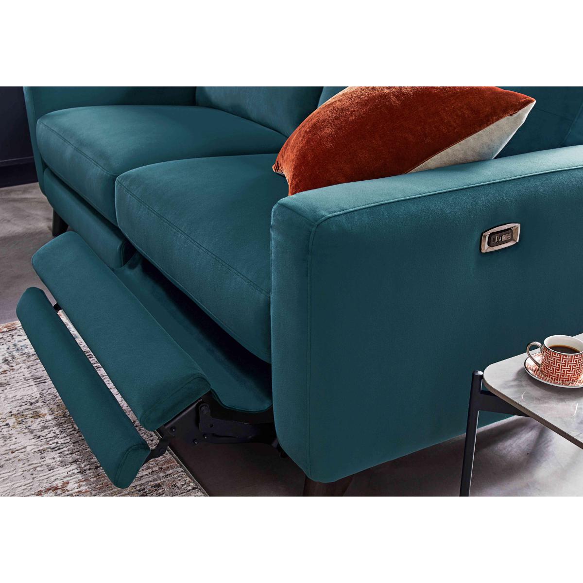 Looking for a sofa that does it all? Meet Jules, the sofa and armchair collection that delivers comfort, style and value. As well as wide arms, sprung seats and superb cushioning, these sofas and chairs also come with power elevating footrests – truly the speediest and most comfortable way to put your feet up. And we think you’ll love the look too. It’s modern yet relaxed, on-trend yet timeless and has simple decorative details and neat wooden feet. The collection is available in your choice of 100% leather or fabric with both upholstery options offering a huge range of colours, and even includes handy storage stools. The incredible-value Jules range is handcrafted exclusively for Furniture Village. This handcrafted and very stylish three-seater recliner sofa has a power-operated elevating footrest that makes relaxing just so effortless. Why you'll love it Lovely 3-seater fabric power recliner sofa makes lounging easy. Relaxed modern style at a great-value price. Kick back in comfort – this sofa has power footrests. Ease into relaxation with wide arms, sprung seats and a supportive back. There’s even a USB port for easy phone charging. In a wide choice of beautiful fabrics, some with decorative leather-style stitching. This sofa is also available in 100% leather and without the power footrest. Handcrafted exclusively for Furniture Village. This 3-seater fabric power recliner sofa is part of our Jules range. What you need to know Medium comfort level. Seat suspension: no-sag spring. Seat cushioning: foam and inner coil. Back suspension: rubber webbing. Back cushioning: fibre. Feet and back are removable. USB charging is only available with the power version of this sofa. Footrest recliner mechanism requires a clearance of 3 cm and may not work successfully over very thick carpets and rugs. Please allow time for new recliners to ease. Minor gaps are necessary to ensure ease of recliner motion and may be exaggerated depending on floor type. Some fabrics can show wear on areas of more use or in direct sunlight. Clean regularly using a soft brush or vacuum with the curtain attachment. Deal with any spills promptly. Professional cleaning advised for oil- and grease-based stains. Please read our upholstery care guide for more advice.