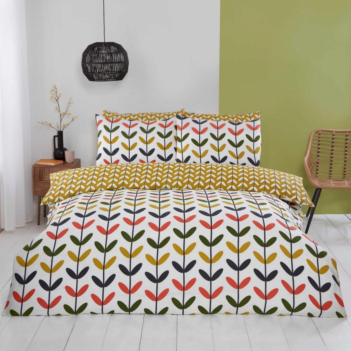 Bring bold, retro charm into your bedroom with the Jules duvet cover set. Featuring a playful Scandinavian-inspired leaf pattern in rich mustard, red, green, and black tones, this eye-catching bedding instantly brightens any space. Crafted from soft, breathable 100 microfibre, this duvet set is both lightweight and durable which is perfect for everyday comfort. With a reversible design, you can switch up your style in seconds, offering two looks in one! Ideal for modern, boho, or mid-century styled homes.