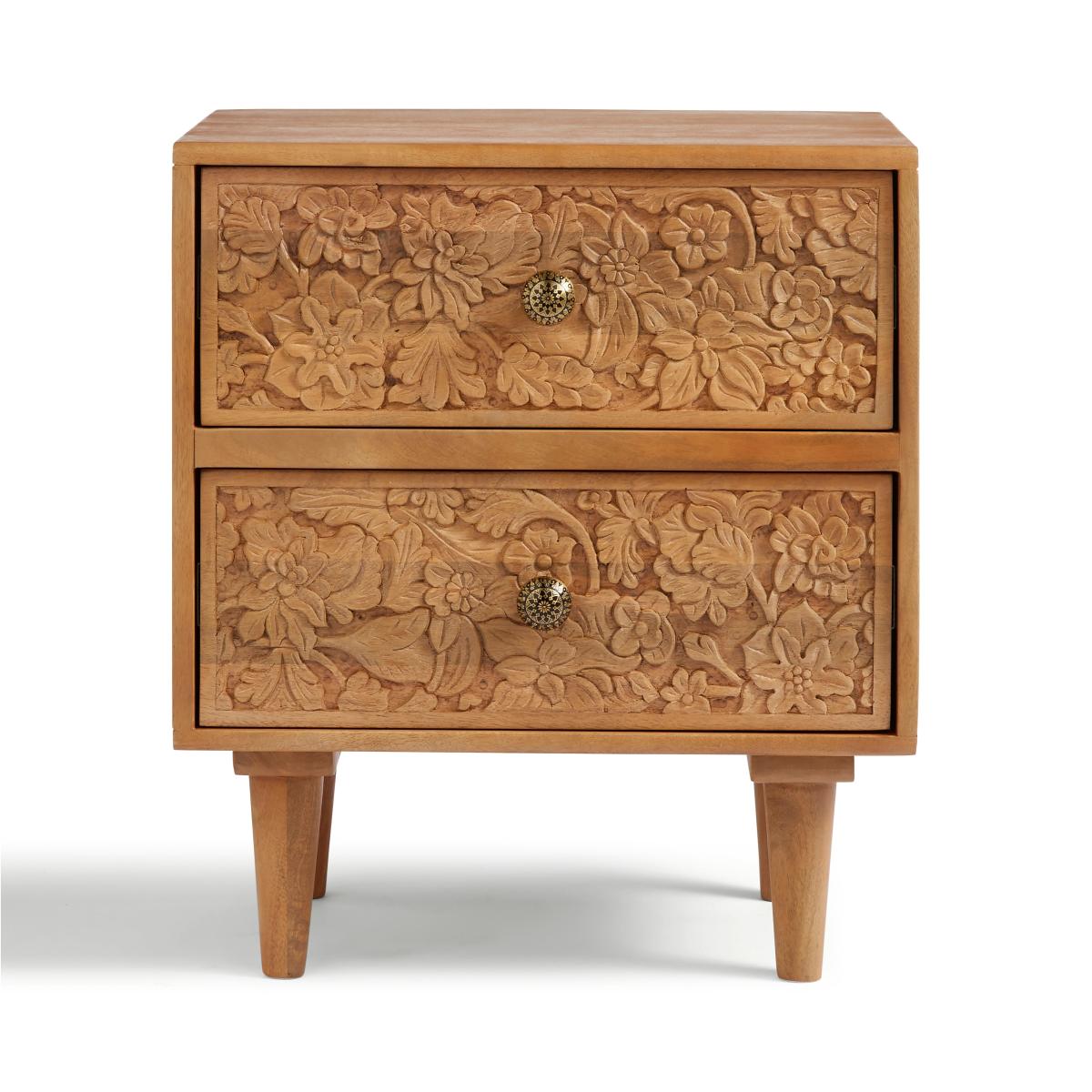 * Mango wood frame * Hand carved details * Side metal runners This bedside table is hand-carved from premium mango wood, featuring intricate details that elevate its aesthetic appeal. The spacious top is ideal for holding your lamp and nighttime essentials, while the drawer offers hidden storage for personal items. Its timeless design and warm wood tones make it a lovely addition to any bedroom, providing both beauty and practicality.