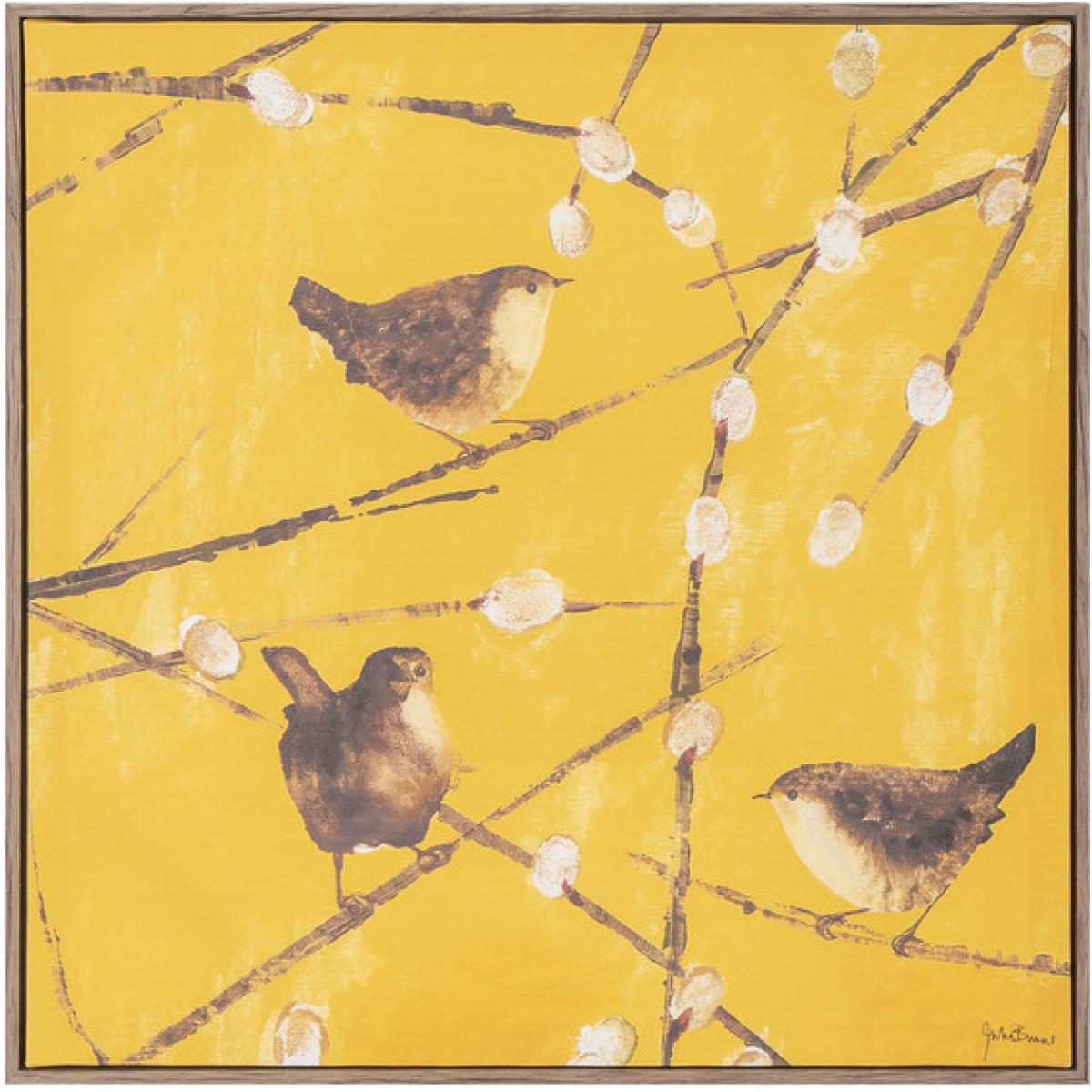 I love this piece for its lively yet sophisticated aesthetic; the vibrant yellow background instantly brings warmth and energy to a space. It's versatile enough to complement both modern and eclectic interiors, working particularly well in living rooms, kitchens, or cosy retreats. When styling, consider pairing it with neutral or muted shades to let the artwork stand out, or incorporate similar yellows or earthy tones elsewhere in the room for a cohesive look. Practical tips include framing it within simple, minimalist surrounds to focus attention, or creating a gallery wall with other nature-inspired pieces for a curated feel. It's an accessible way to add colour and personality to your space without overwhelming the room.