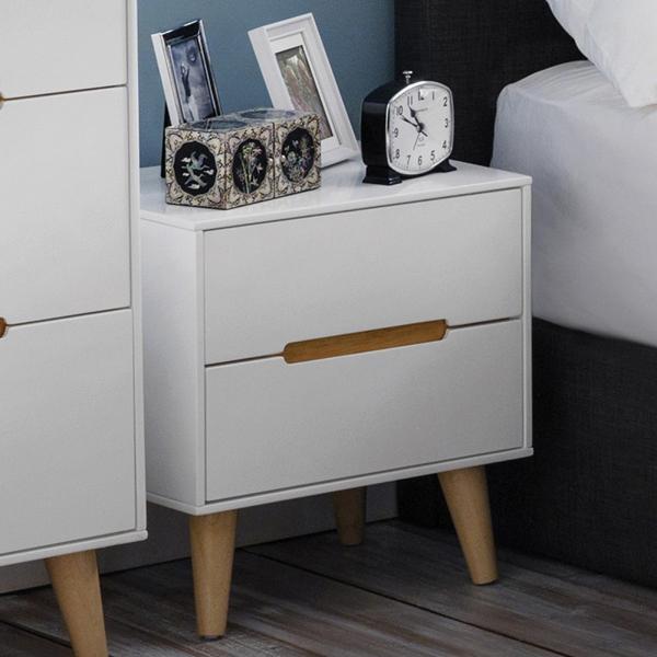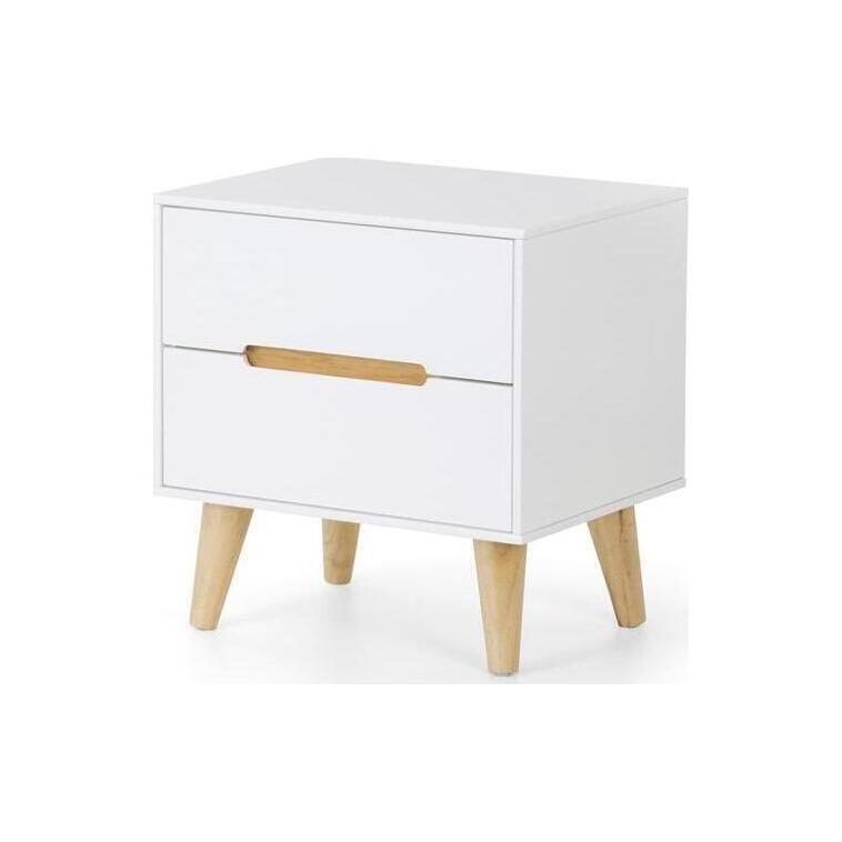 A stylish, retro-inspired bedside cabinet with two drawers in an immaculate matt white lacquered finish, with complementary tapered oak finish legs and recessed handles to provide easy opening. The sleek Scandinavian feel fits beautifully with any décor.