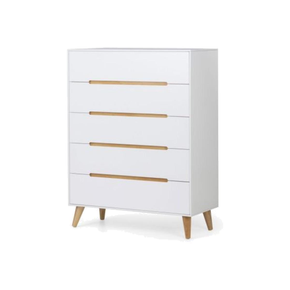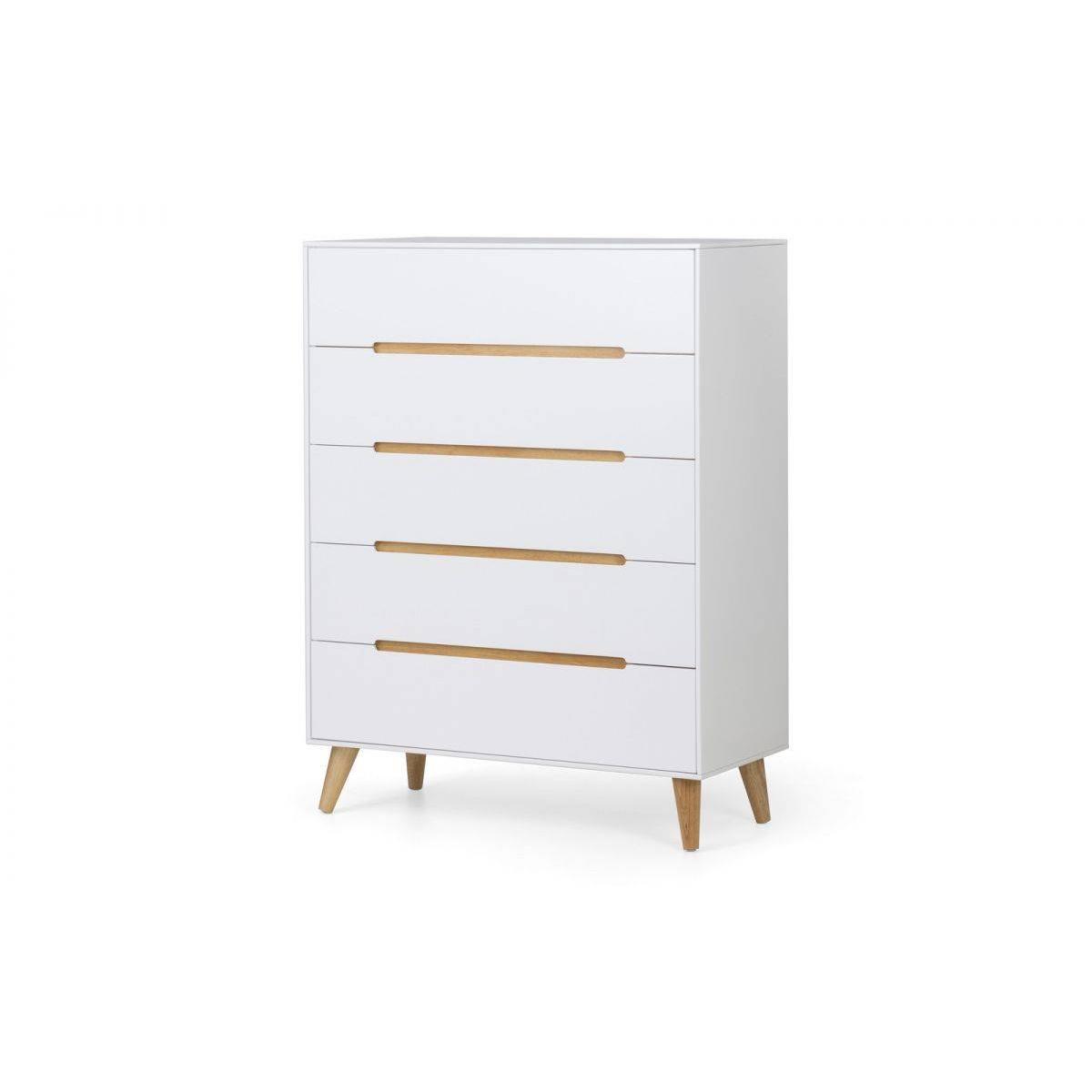 A stylish, retro-inspired chest with five large drawers in an immaculate matt white lacquered finish, with complementary tapered oak finish legs and recessed  handles to provide easy opening. The sleek Scandinavian feel fits beautifully with any décor. Features: Dimensions: 40cm D x 90cm W x 118cm H Immaculate matt white lacquered finish Tapered oak finish legs Five drawers Internal drawer dimensions - 81cm x 34cm x 13cm Part of Julian Bowen's Alicia bedroom range Requires assembly