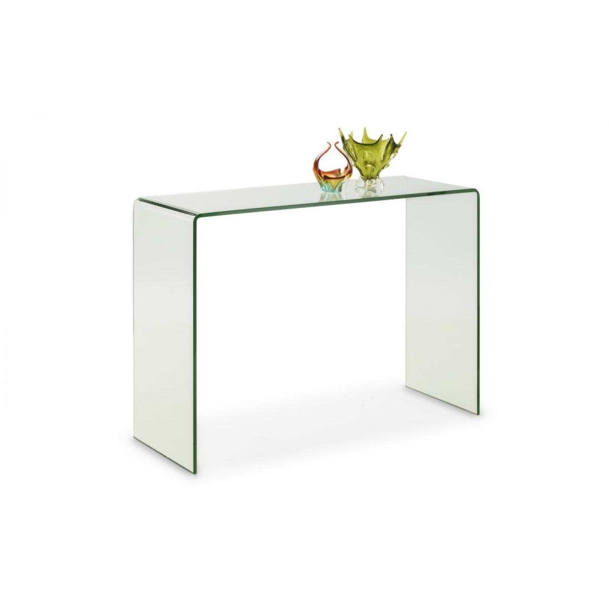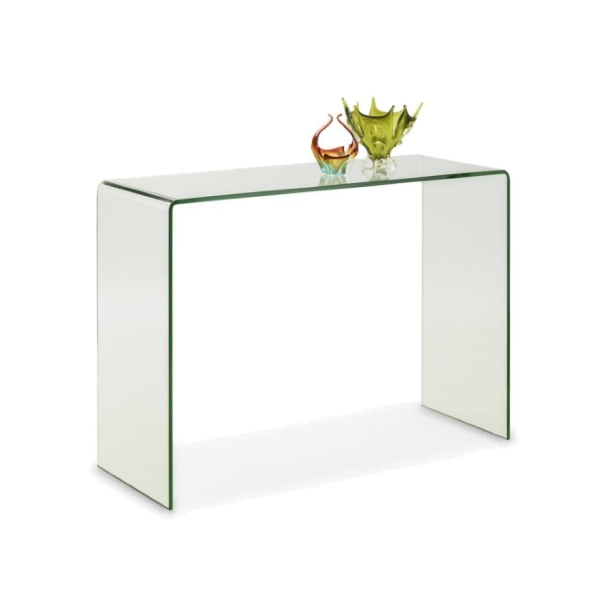 This Amalfi bent glass console table is beautifully crafted from a single sheet of tempered glass, bent and moulded into a curvacious design with no joins or fixings. From a collection of three pieces, the Julian Bowen Amalfi clear glass range will create the feeling of more space in your home, whilst adding a touch of elegance.  12mm Tempered Clear Glass Constructed from a single piece of tempered glass Glass complies with BS EN 12150:2000 Clause 8 - Fragmentation A clear glass design, adding the illusion of more space within your home. Dimensions: Height: 76cm Width: 110cm Depth: 40cm