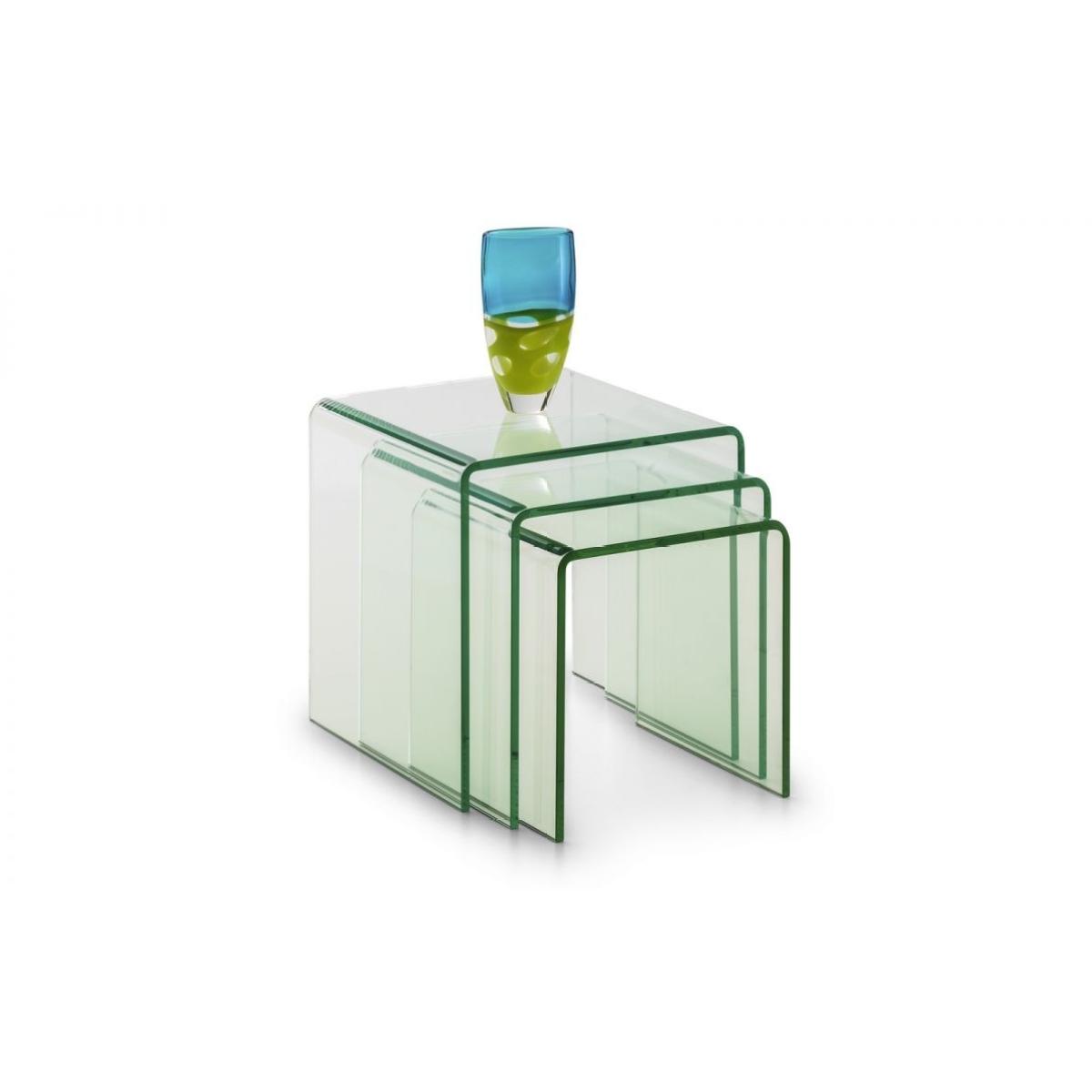 This Amalfi bent glass nest of tables is beautifully crafted from a single sheet of tempered glass, bent and moulded into a curvacious design with no joins or fixings. From a collection of three pieces, the Julian Bowen Amalfi clear glass range will create the feeling of more space in your home, whilst adding a touch of elegance.  Glass complies with BS EN 12150:2000 Clause 8 - Fragmentation Constructed from a single piece of 12mm tempered glass A clear glass design, adding the illusion of more space within your home. Part of Julian Bowen's Amalfi glass collection Large table dimensions: 43cm H x 43cm W x 43cm D  Medium table dimensions: 38cm H x 38cm W x 38cm D Small table dimensions: 33cm H x 33cm W x 33cm