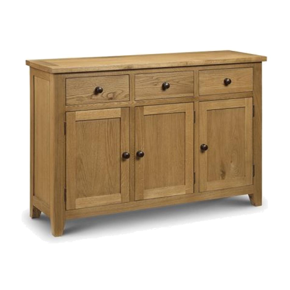 This modern chunky sideboard from Julian Bowen's Astoria collection is perfect for adding valued storage space to any living or dining room. Beautifully crafted from Solid Oak and Oak Veneers, the Astoria Sideboard features three drawers and a double and single cupboard with metal handles. Waxed Oak Finish Fully Assembled Construction Constructed from oak veneers Dimensions: 128cm (W) x 40cm (D) x 86cm (H) 1 Year Manufacturer's Guarantee Please note, this product is an online exclusive and is not available to view in any of our stores.