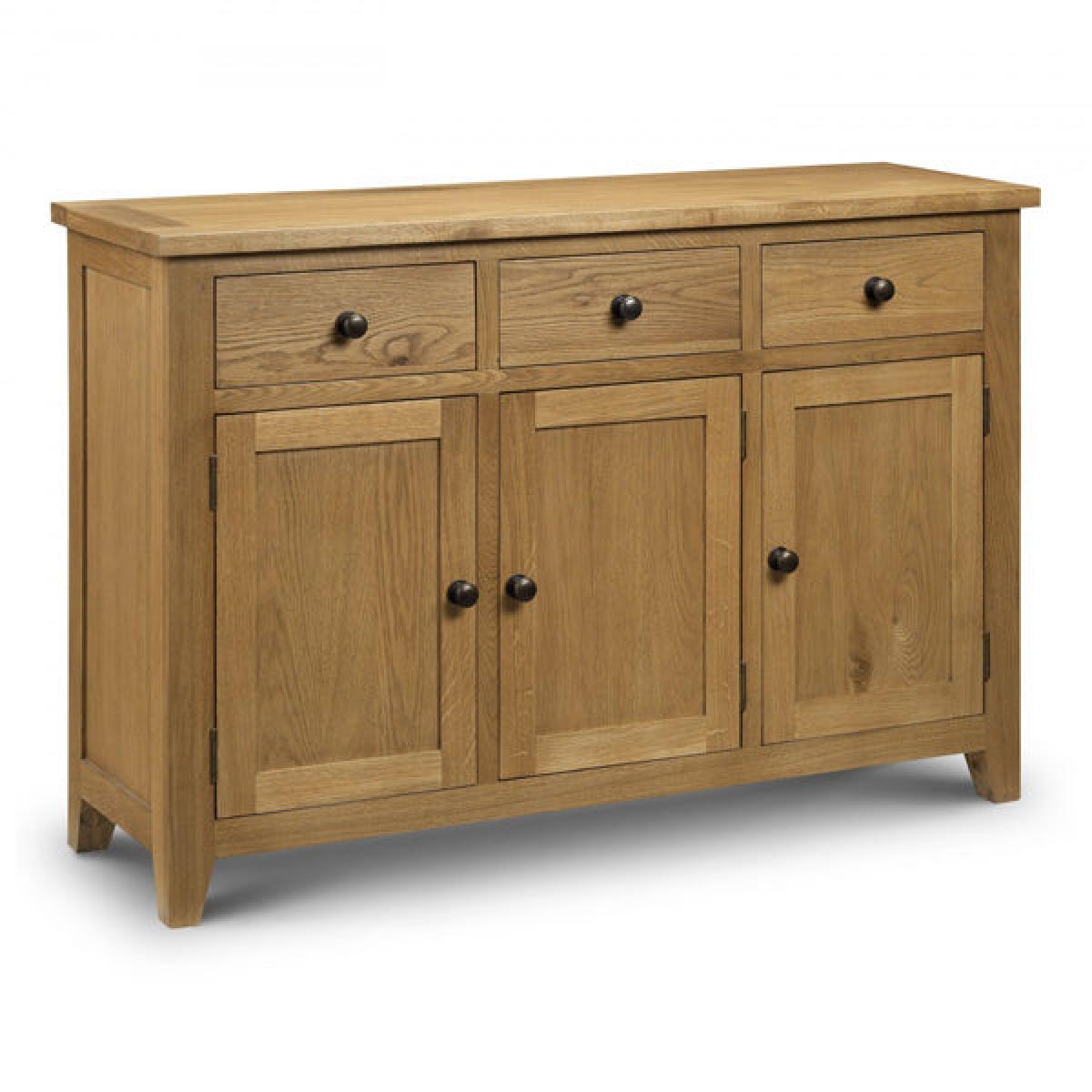 The Astoria Sideboard is crafted from White Oak and Oak Veneers with a durable waxed finish. The perfect storage unit for the modern living or dining room, incorporating 3 drawers above a double and single cupboard space. A timeless design with chunky tops that complements contemporary and traditional interior styles equally well. With a range of coordinating furniture from the Julian Bowen Astoria range to create a warm, traditional feel in your home.