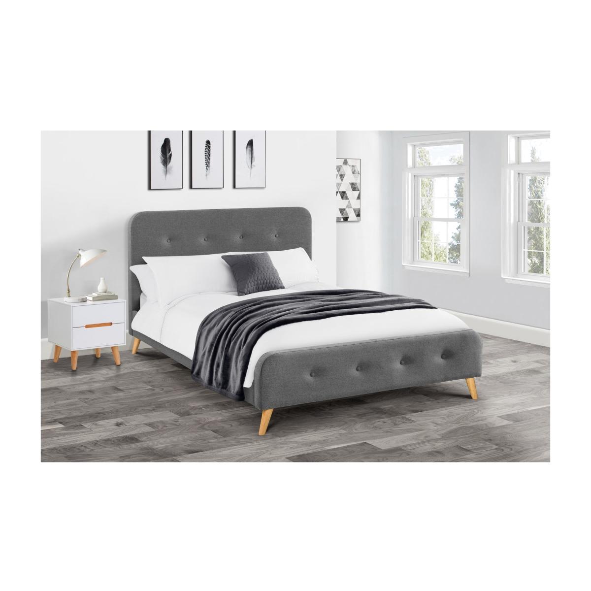 Dimensions W160cm x D214cm x H100cm Features. Classic Scandinavian design. Sumptuous Grey Linen Style Fabric Light oak coloured splayed legs. Neatly buttoned headboard Perfect companion to the Julian Bowen Alicia Bedroom Collection..