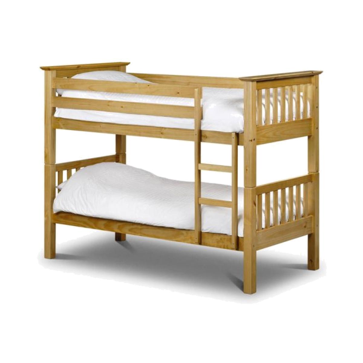 Finished in a charming Antique Pine, the Julian Bowen Barcelona Bunk Bed is a stylish and resilient bed that's ideal for any childrens bedroom.  These versatile beds have been inspired by the much sort after shaker style and made more child friendly, with solid pine slatted base, fitted ladder and safety railing on the top bunk the Julian Bowen Barcelona Bed is ideal for even the most active little monkeys. Upper bunk only suitable for a 18cm depth mattress (sold separately) 90 x 190cm mattress size (sold separately) Solid pine with low sheen lacquer finish Un-Assembled Dimensions 209cm x 107cm x 159cm