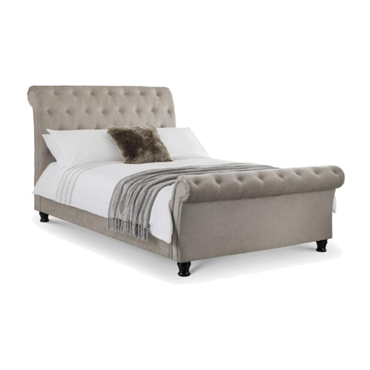 Ravello is a stunning fabric bed in a classic scroll design, finished in a lovely soft touch mink chenille. It is a substantial bed characterised by exquisitely finished sumptuous upholstery and a striking deep buttoned high headboard with matching footboard. Ravello adds a wow factor to any bedroom and is a perfect match for traditional and contemporary interiors alike. A sprung slatted base ensures extra comfort and prolonged mattress life. H:120 x W: 163 x D: 246 x Head H: 120 x Foot H: 67. 3 cm.