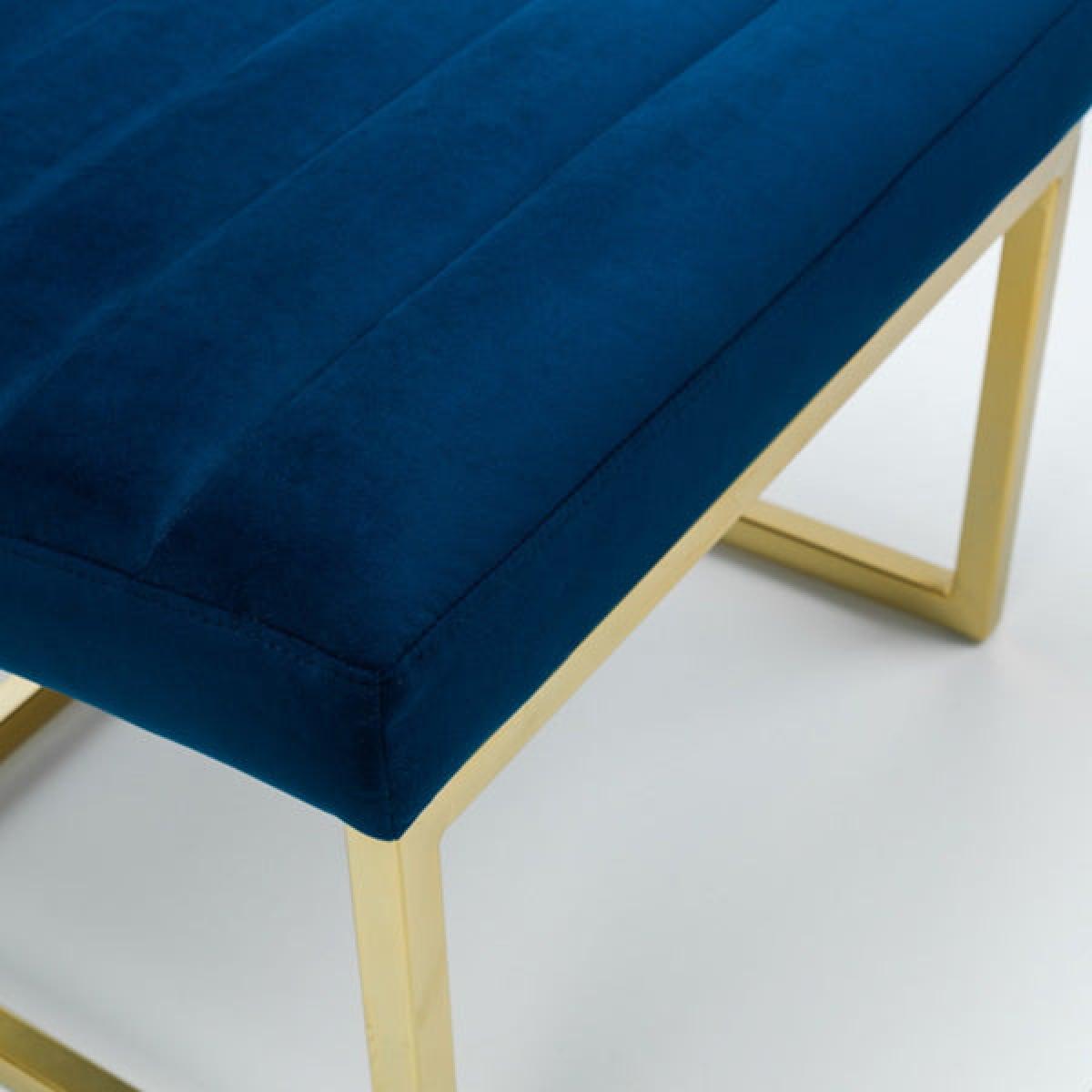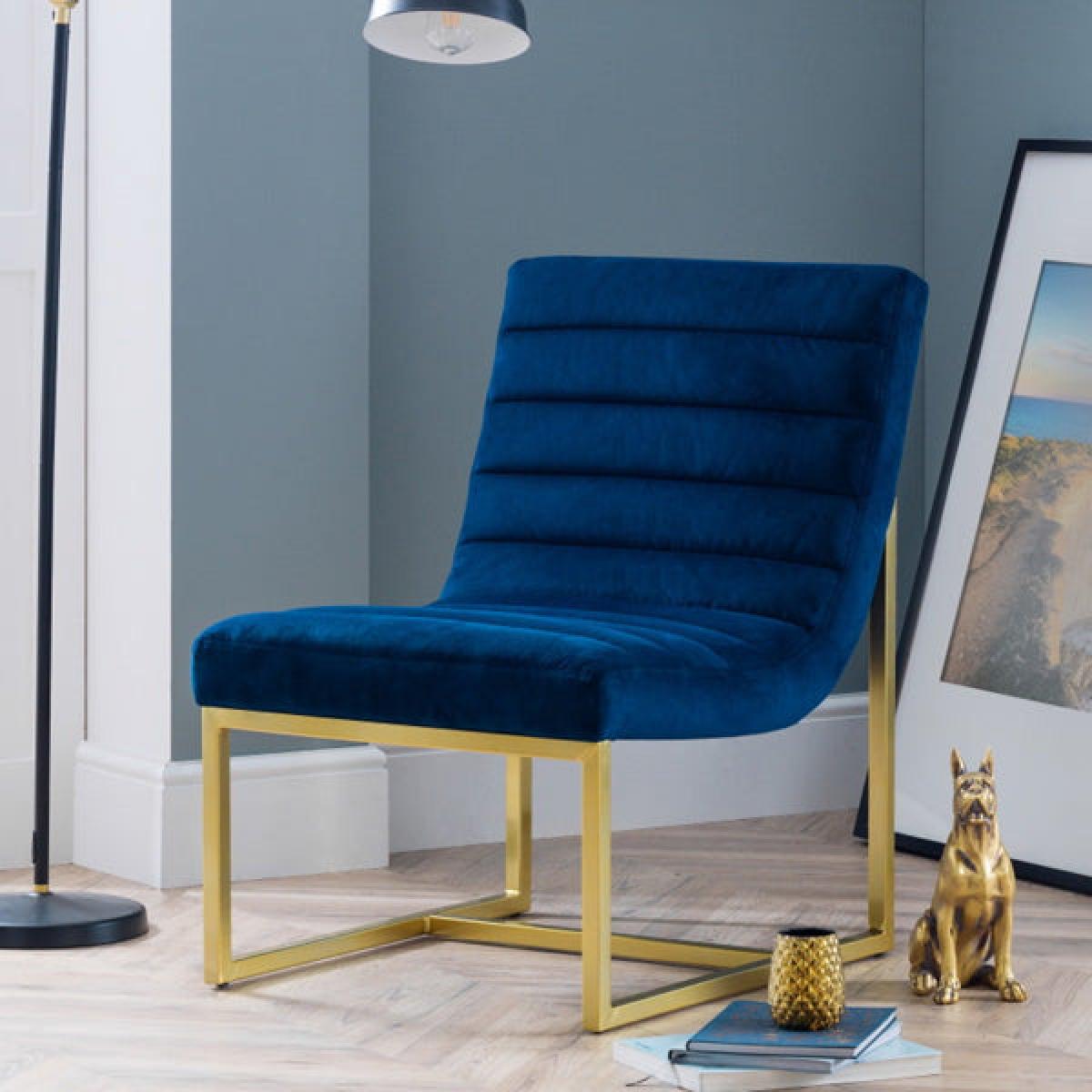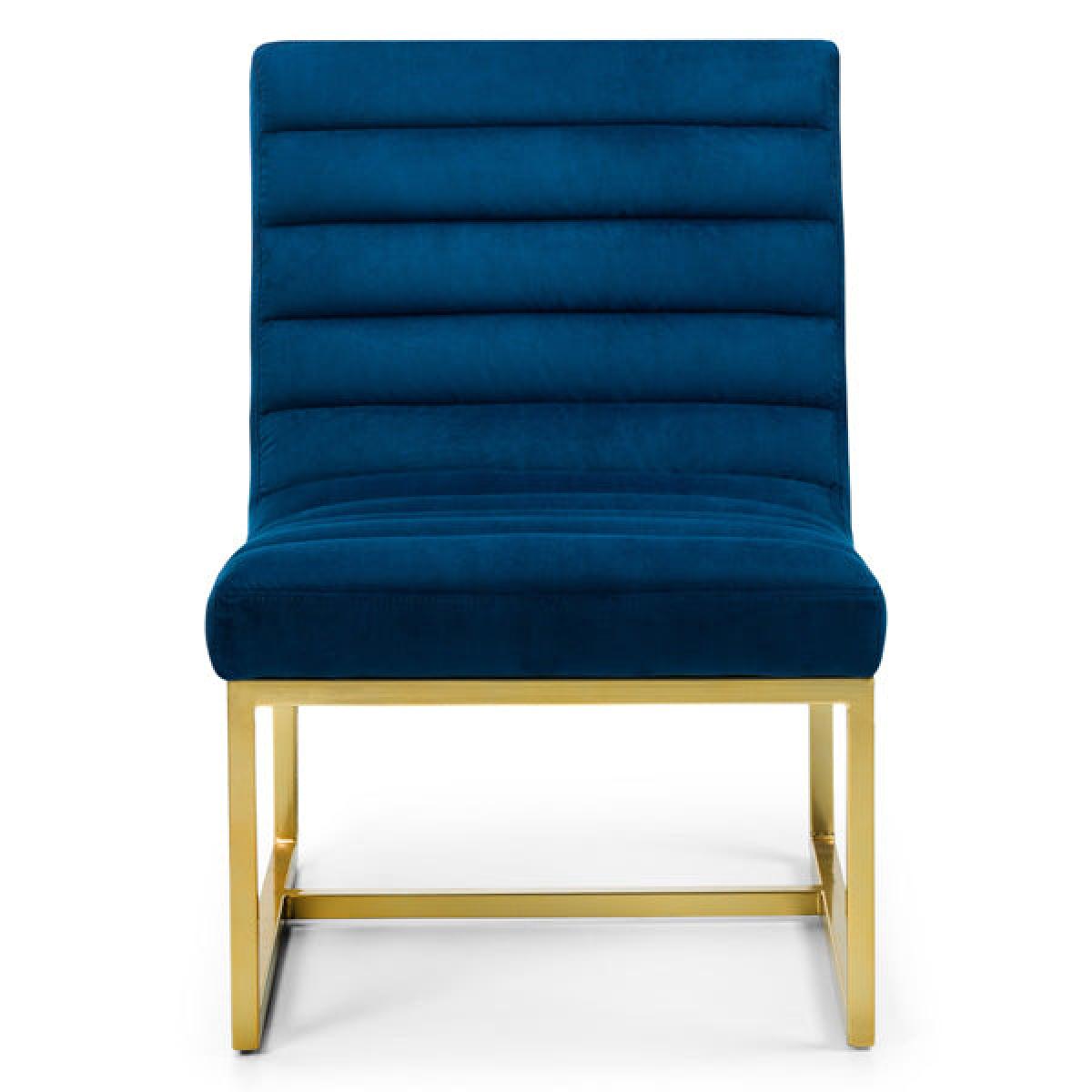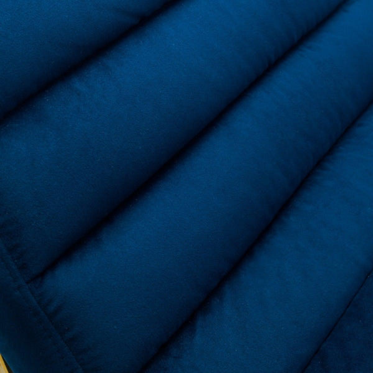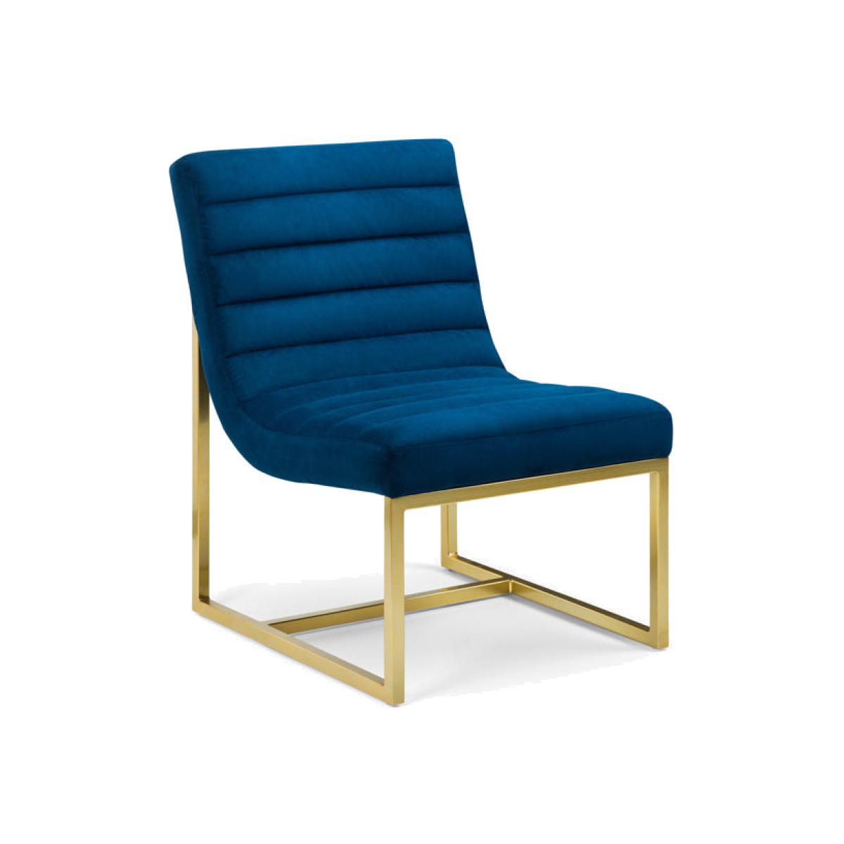 The Bellagio chair is upholstered in an eye-catching blue velvet fabric, upon a luxurious, modern gold frame. This accent chair features tufting on the seat and back, adding a touch of elegance to the design, perfect for any contemporary setting.