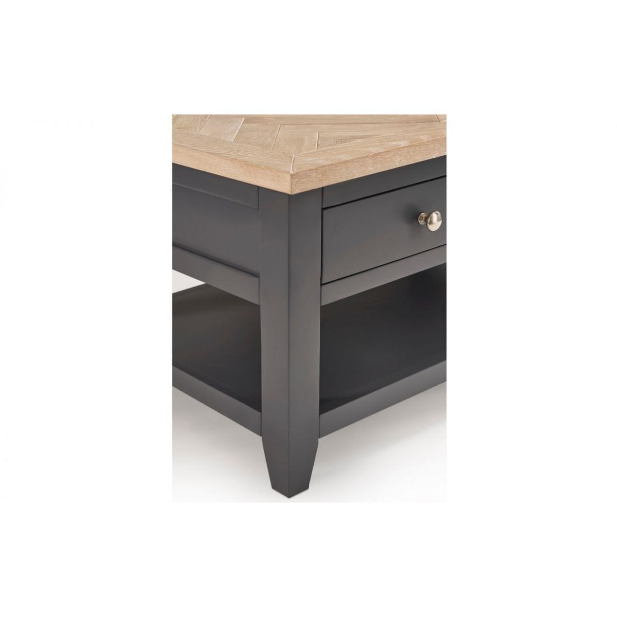 Designed exquisitely, the Bordeaux collection is finished in a beautiful grey shade that will complement various existing décor styles. The parquet detailing leaves an elegant and rustic feel – the perfect way to make your house feel like a home. The gorgeous collection includes an extending dining table, dining chair, coffee table, sideboard, lamp table, nest of tables, tv unit, and tall bookcase.  Dark Grey Lacquered Finish Substantial Parquet Top Part of Julian Bowen's Bordeaux Collection Solid Oak with Real Oal Veneers Dimensions Length: 100cm Width: 60cm Height: 50cm Internal drawer dimensions - 37.5cm x 52cm x 9.5cm Internal shelf dimensions - 96cm x 56cm x 17cm All screens vary in colour reproduction and whilst every effort has been made to display the colour as accurately as possible it is for guidance only