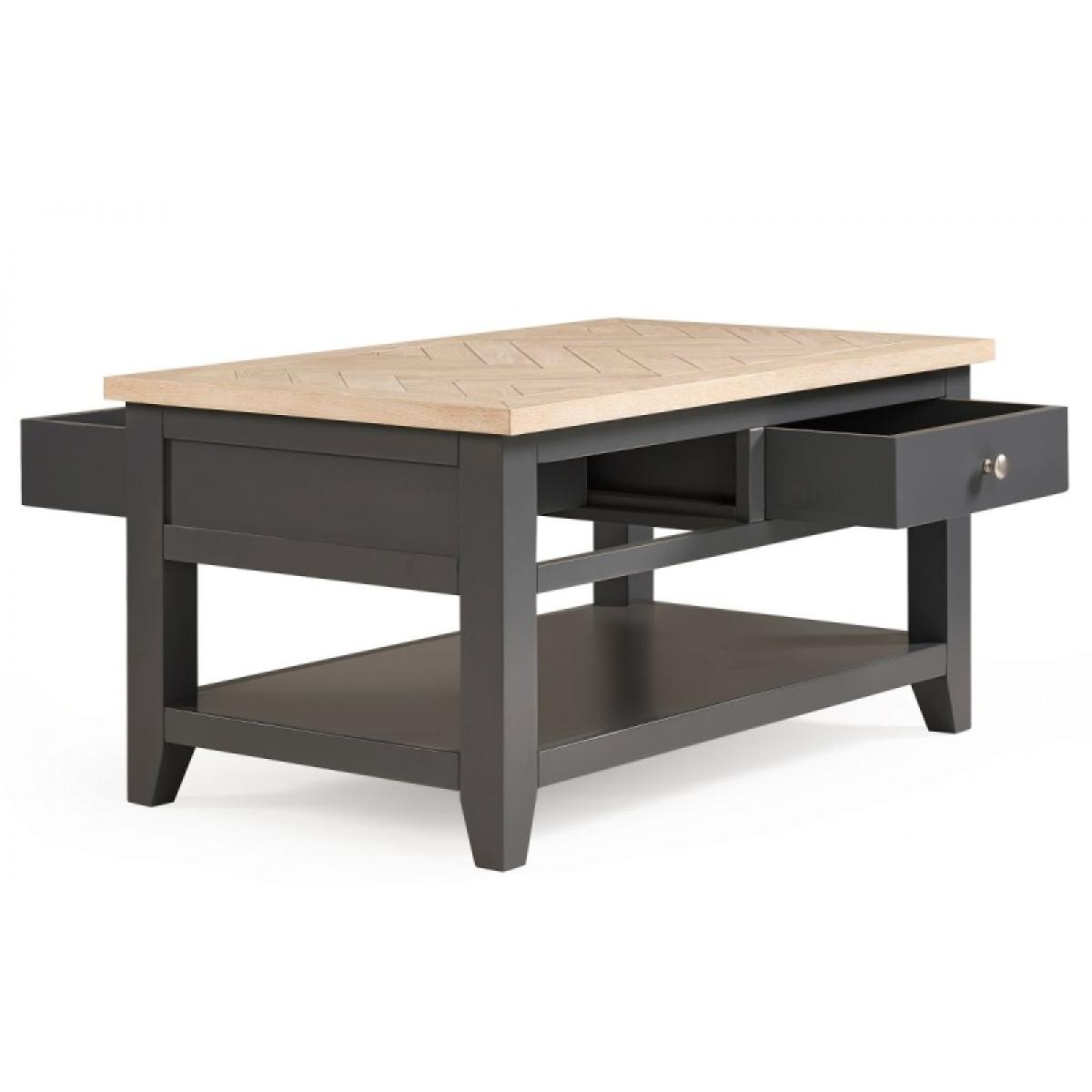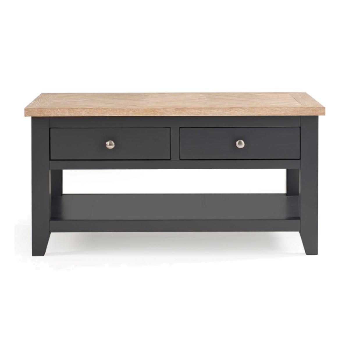 I love this dark grey coffee table because of its versatile, contemporary look with a touch of natural warmth from the wooden top. It works well in a variety of interiors, from modern, minimalist spaces to more traditional living rooms that could benefit from a subtle pop of colour. The dual drawers offer practical storage, making it perfect for keeping remote controls, coasters, or magazines close at hand without cluttering the surface. For styling tips, consider layering with a couple of books, a small plant, or a decorative tray for added interest. This piece's neutral colour makes it adaptable to different colour schemes and easy to dress up or down with accessories.