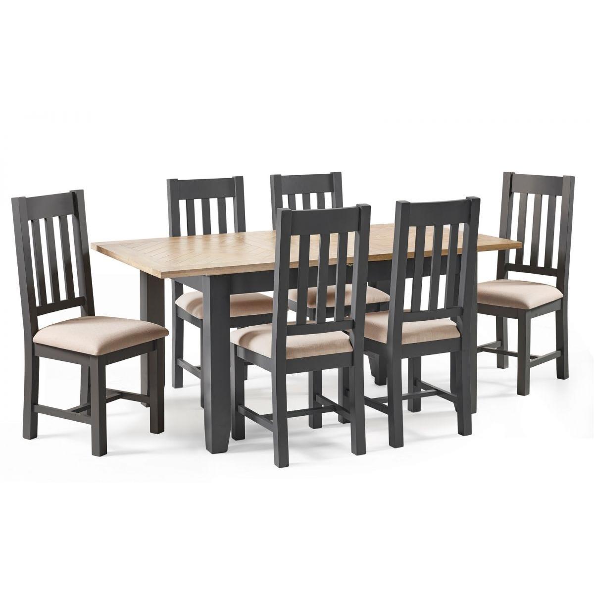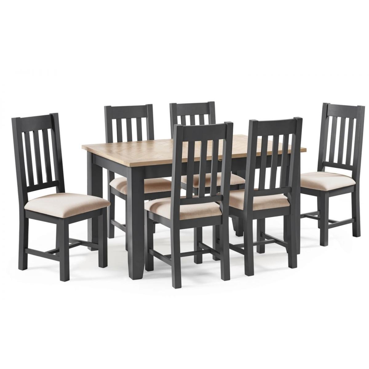 Designed exquisitely, the Bordeaux Dining Set is finished in a beautiful grey shade that will complement various existing décor styles. The parquet detailing leaves an elegant and rustic feel – the perfect way to make your house feel like a home.  This classic dining table features a 40cm butterfly extension system that is easy to use and stores within the table when not in use. Dark Grey Lacquered Finish Substantial 35mm Parquet Top Easy to use butterfly extension mechanism Part of Julian Bowen's Bordeaux Collection Solid Oak with Real Oak Veneers  Assembly required 12 month product guarantee Dimensions Lenth: 140-180cm extended Width: 78cm Height: 90cm Please note, all screens vary in colour reproduction and whilst every effort has been made to display the colour as accurately as possible it is for guidance only.