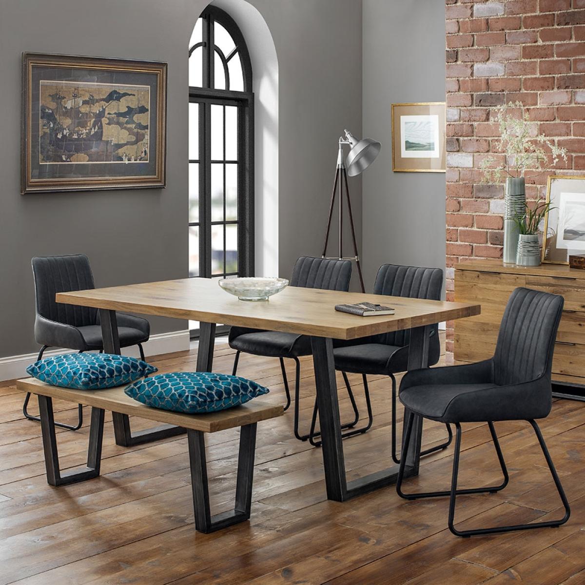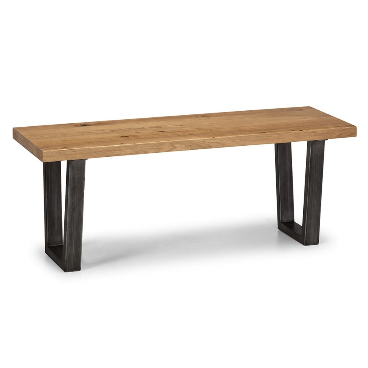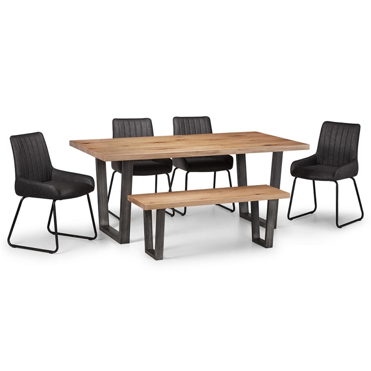 With a solid oak top and sturdy metal legs, the Brooklyn Dining Set with 4 Soho Chairs & Bench from Julian Bowen will bring a vintage feel to your home. Perfect in the kitchen or dining room with enough room to seat 6, whether it's enjoying a night of dinner and drinks with friends or a Sunday roast with the family it is sure to transform your dining area. The black faux leather chairs with a simple metal frame will offer plenty of support whilst you relax. And the matching Oak bench completes the rustic look! Available in other sizes and configurations, there's a Brooklyn set to suit your space!.