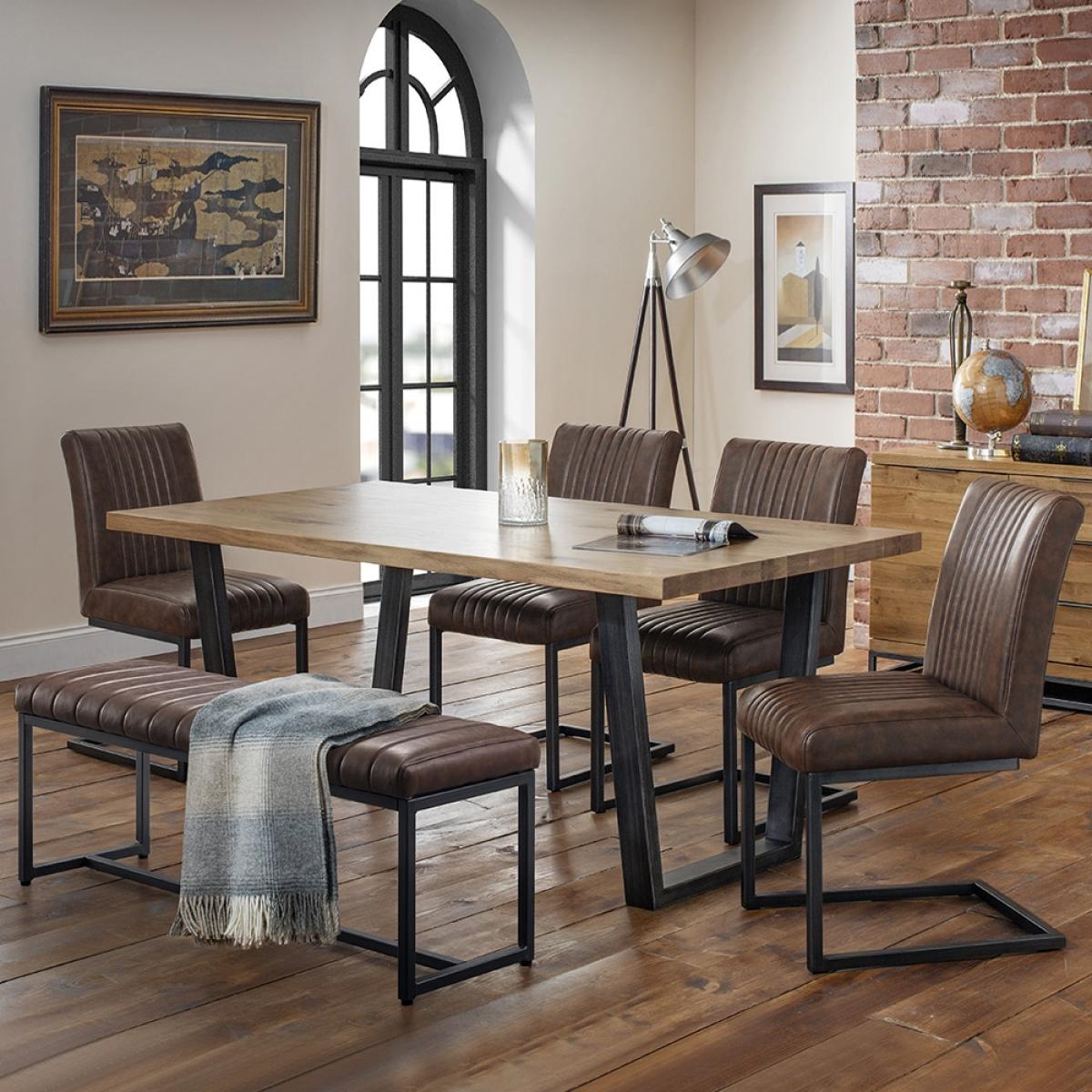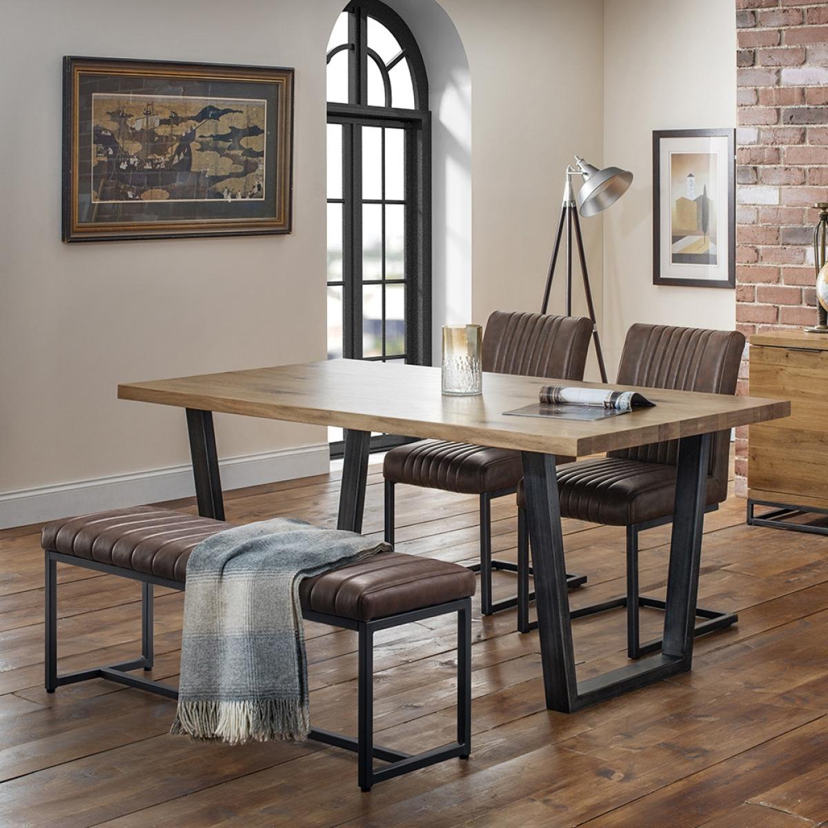 With it's industrial style, the Brooklyn Dining Set with Brooklyn Chairs & Upholstered Bench from Julian Bowen is sure to look stunning in your dining area. Combining a solid oak tabletop and sturdy metal legs, this table will be that welcome change you've been after. Available with either 2 or 4 chairs, whatever the size of your family there will be an option for you. Whether used in the dining room or as a kitchen table, gather the family for Sunday breakfast or invite friends over for a games night. The brown faux leather chairs feature a high seat back and a contemporary base that offer plenty of support while you relax. Plus, the matching upholstered bench completes the modern look! Available in other configurations, there's a Brooklyn set to suit your space!.