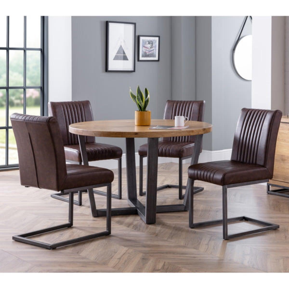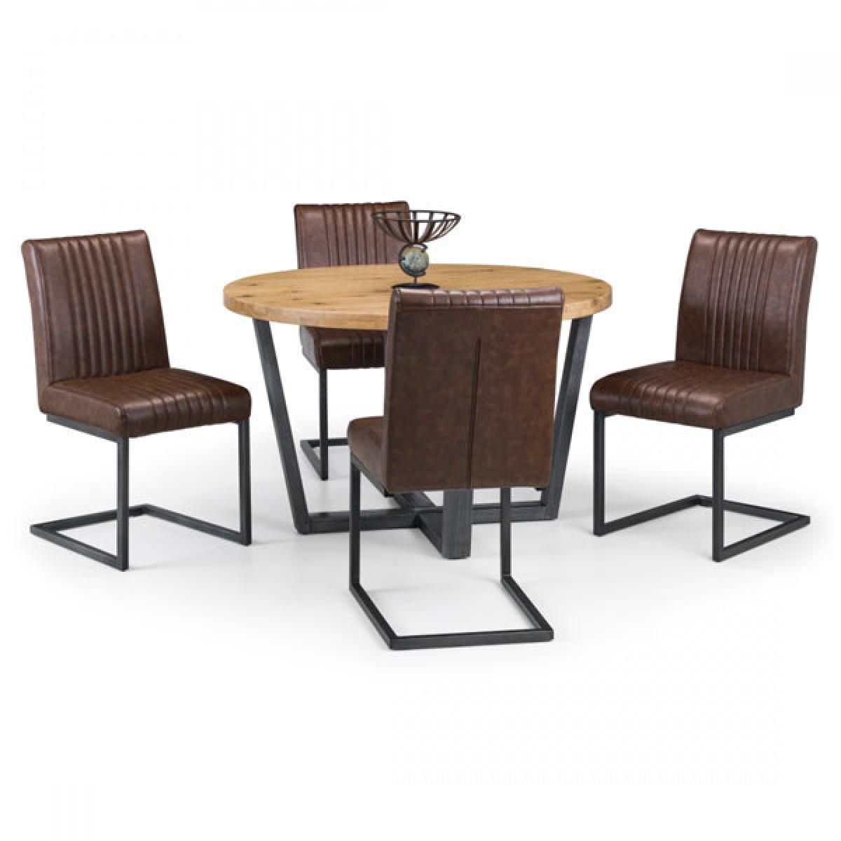Made from solid oak, this round dining table offers a rustic finish emphasising the stunning natural wood grain. The Brooklyn Round Dining Table offers a vintage edge featuring industrial trestle style metal legs. This spacious table can seat up to 4 people, perfect for a wide range of modern decor. Part of the Julian Bowen Brooklyn Dining and Occasional Collection, also a great match with the Soho Dining Chairs.