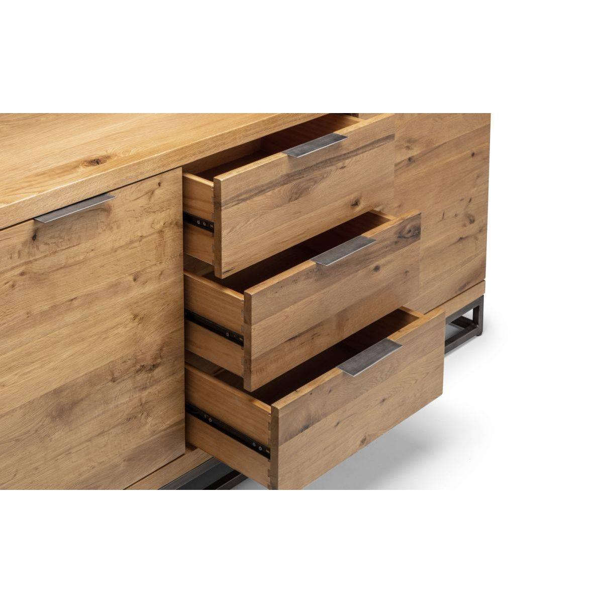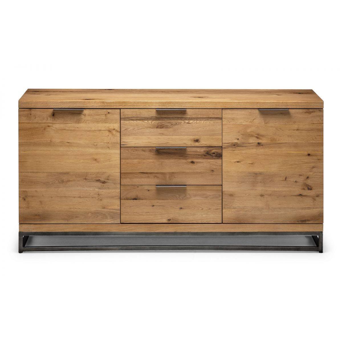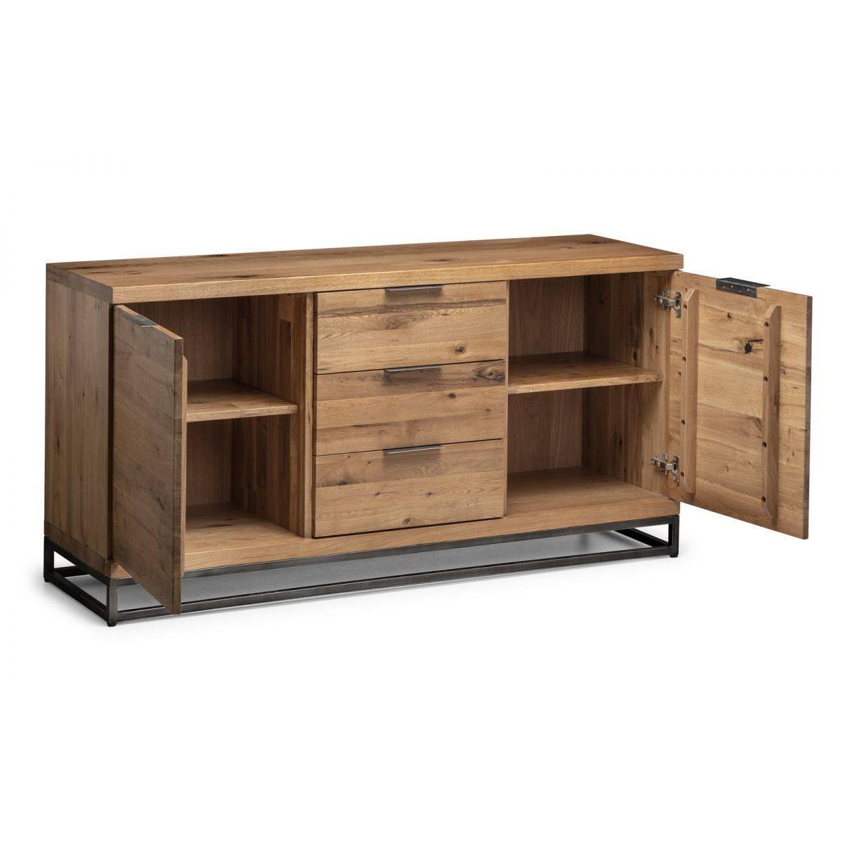 Made from solid oak, this Sideboard offers a rustic finish emphasising the stunning natural wood grain. The Brooklyn Sideboard offers a vintage edge featuring industrial style metal legs. Feautring two spacious cupboards with shelves, and three drawers, this sideboard is perfect for a wide range of modern decor. Part of the Julian Bowen Brooklyn Dining and Occasional Collection. Dimensions: 45cm (D) x 150cm (W) x 75.5cm (H)