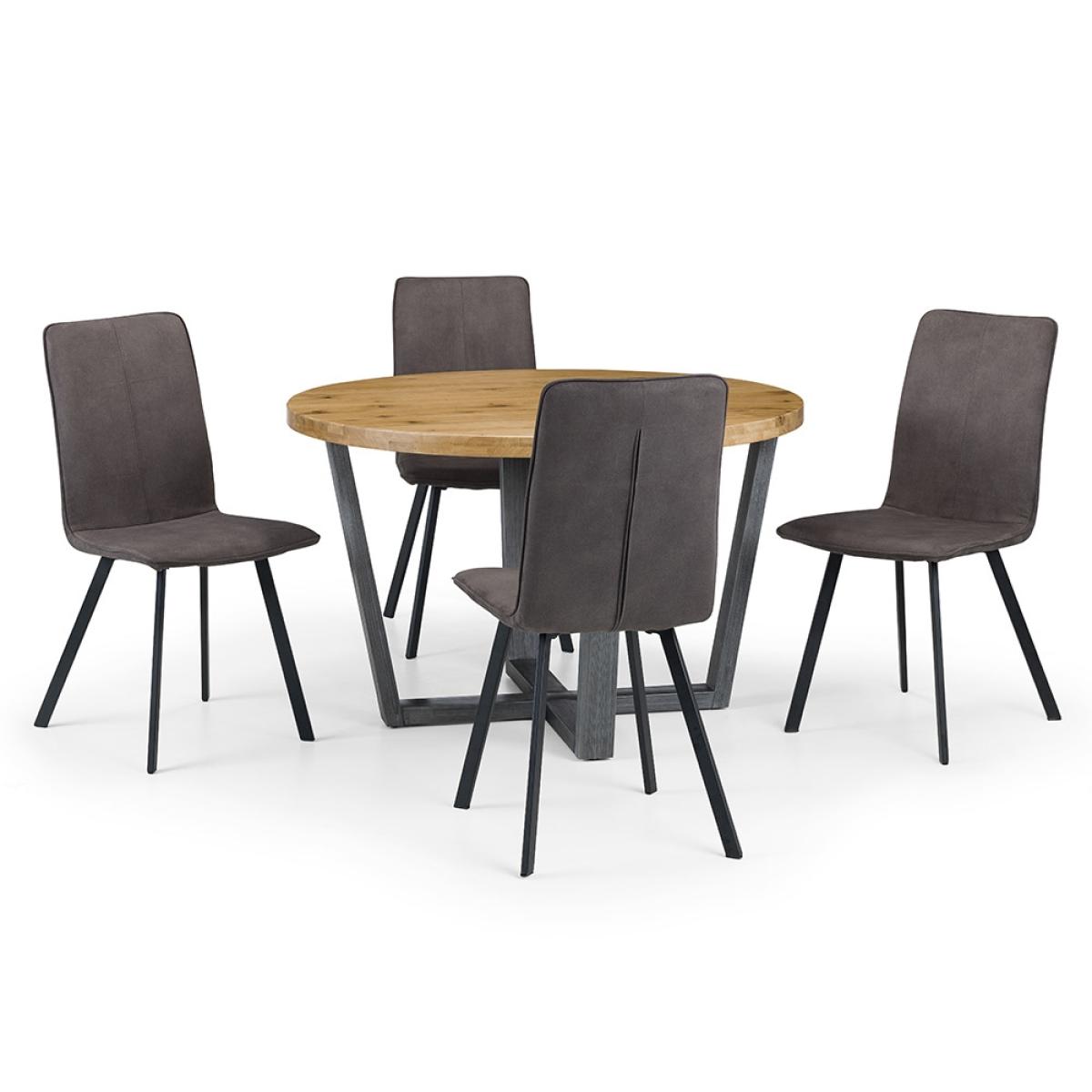 Gather the family around the Brooklyn Round Dining Set with Monroe Chairs from Julian Bowen and enjoy that Sunday roast. The solid oak table top paired with the metal frame will bring a stylish yet industrial feel. Perfect in the kitchen or dining room with enough room to seat 4, enjoy home made meals surrounded by family and friends. The charcoal grey upholstered chairs with slender steel legs feature a high back offering up plenty of support, allowing you to relax long after the food has gone. Available in other configurations, there's a Brooklyn set to suit your space!.