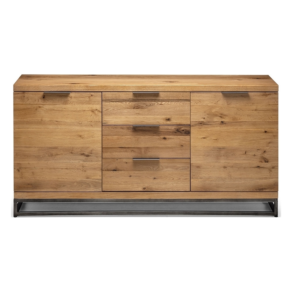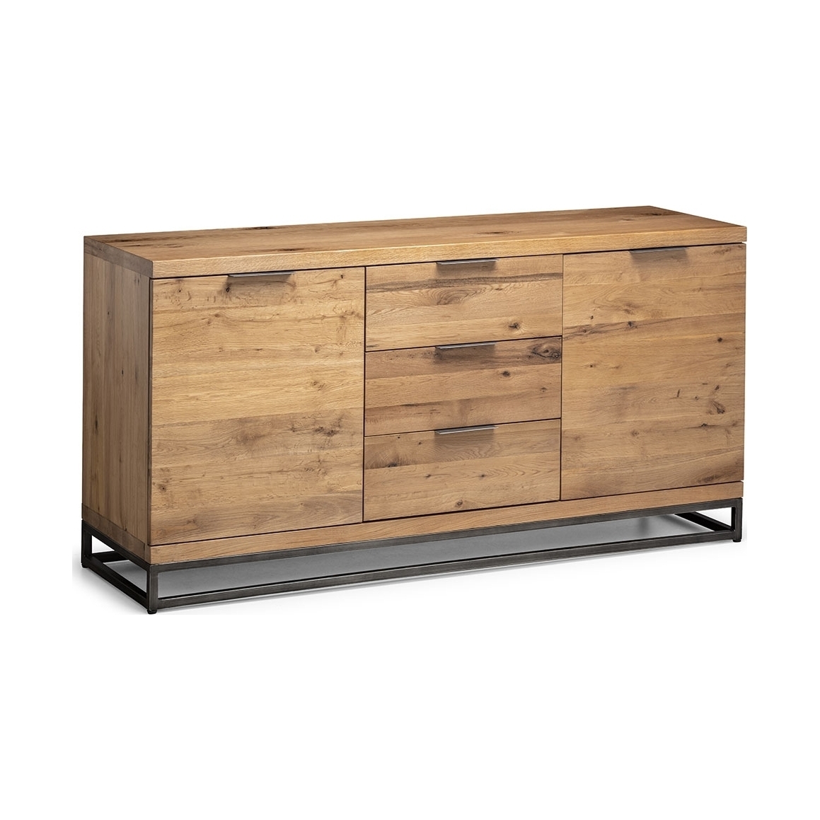 With its rustic styling, the Brooklyn Sideboard from Julian Bowen is the perfect way to upgrade your storage. A wonderful addition to the dining room, living room, kitchen or even the hallway, this beauty will be happy to store your goods. Finished in solid oak with sturdy gunmetal grey legs, this cabinet is sure to inject some industrial style into your home. Complete with two cupboards featuring a shelf each, keeping your dinnerware neat and tidy will be one easy task plus the drawers in the centre are great for tablecloths and placemats. Part of the Brooklyn collection, why not give your home a revamp.