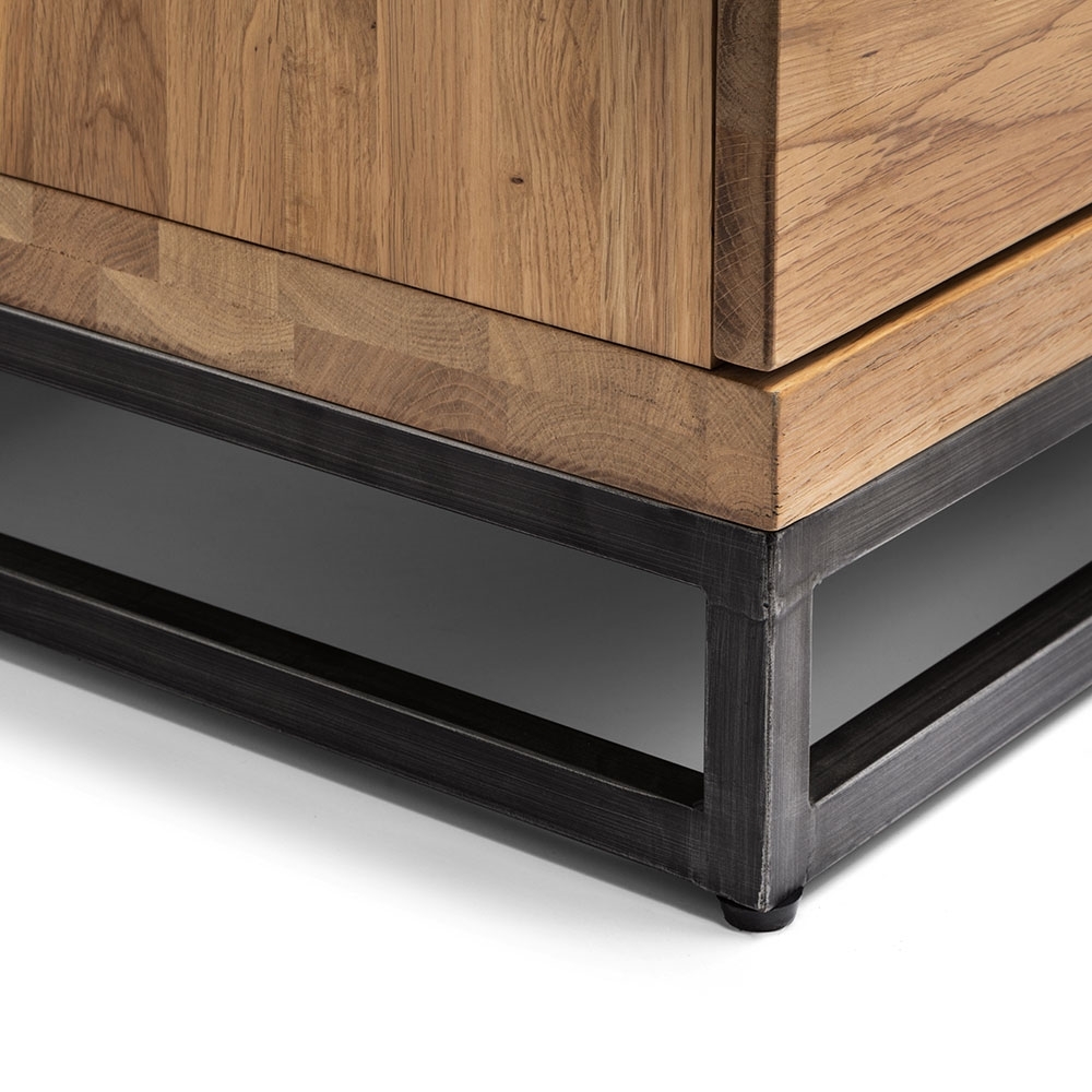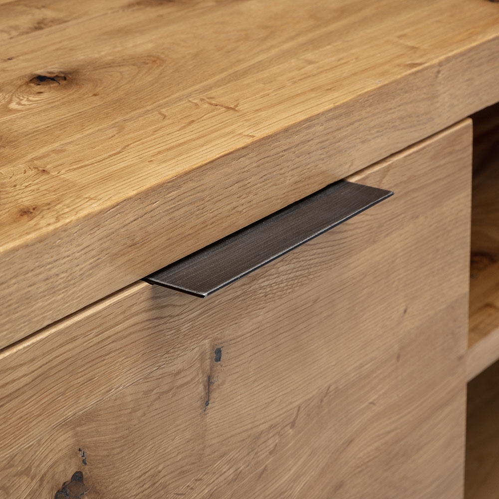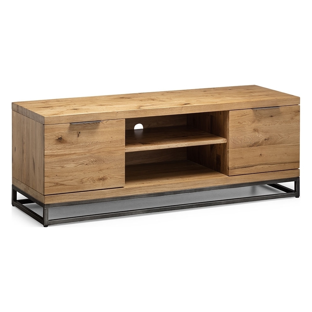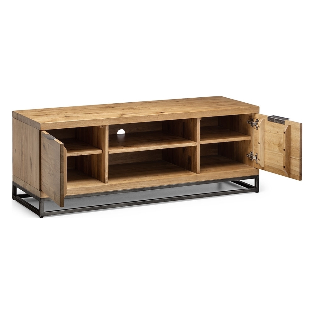 No more mess of wires behind the TV when you've got the Brooklyn TV Unit from Julian Bowen to keep them all tidy and hidden away. Finished in solid oak with sturdy gunmetal grey legs, this TV stand is sure to inject some industrial style into your home. Complete with two closed cupboards and shelving space in the centre, there be plenty of room to store games consoles, remotes and DVDs. Now all you need to do is get the popcorn ready, sit back and relax. Pair with other pieces from the Brooklyn range to complete the look.