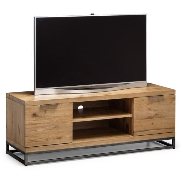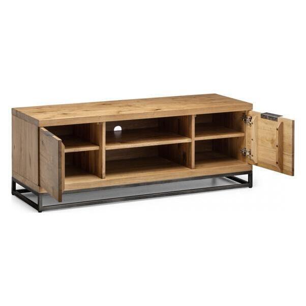 Made from solid oak, this TV Unit offers a rustic finish emphasising the stunning natural wood grain. The BrooklynTV Unit offers a vintage edge featuring industrial style metal legs. Feautring two cupboards with shelves, and an additional shelf in the middle suitable for a console, this TV Unit is perfect for a wide range of modern decor. Part of the Julian Bowen Brooklyn Dining and Occasional Collection.