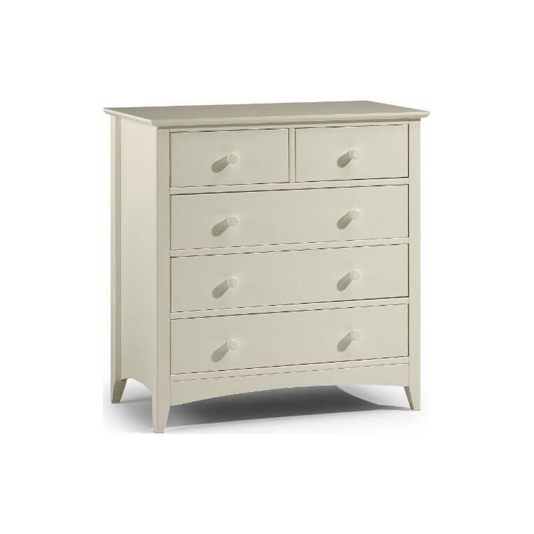 Cameo is a beautiful stone white lacquered bedroom range. Its timeless shaker design is the perfect accompaniment to any interior style and is perfect for grown-up bedrooms and children's bedrooms alike. Solid pine frames ensure a sturdy and durable construction. The Cameo 3+2 chest offers a great storage solution with 2 small drawers and 3 large drawers.