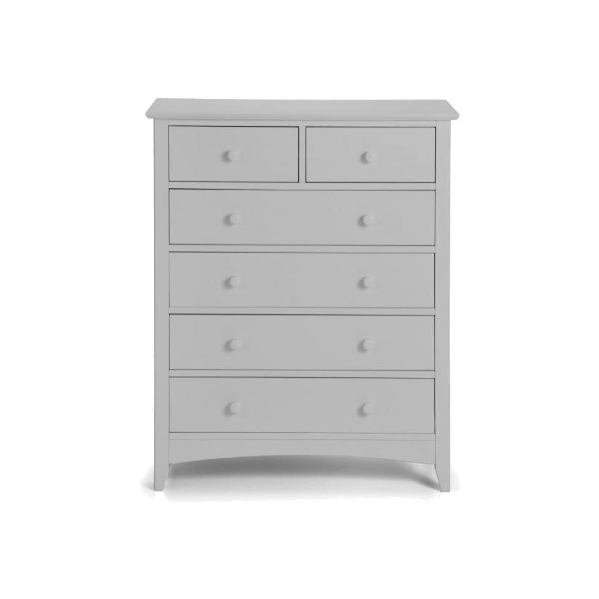 Cameo is a beautiful dove grey lacquered bedroom range. Its timeless shaker design is the perfect accompaniment to any interior style and is perfect for grown-up bedrooms and children's bedrooms alike. Solid pine frames ensure a sturdy and durable construction. The Cameo 4+2 chest offers a great storage solution with 2 small drawers and 4 large drawers. Dove Grey painted finish Lacquered Pine & MDF Pine Runner Assembly required Dimensions: 101cm (H) x 83cm (W) x 43cm (D) 4 large drawers, 2 small drawers 1 Year Manufacturer's Guarantee Please note, this product is an online exclusive and is not available to view in any of our stores.