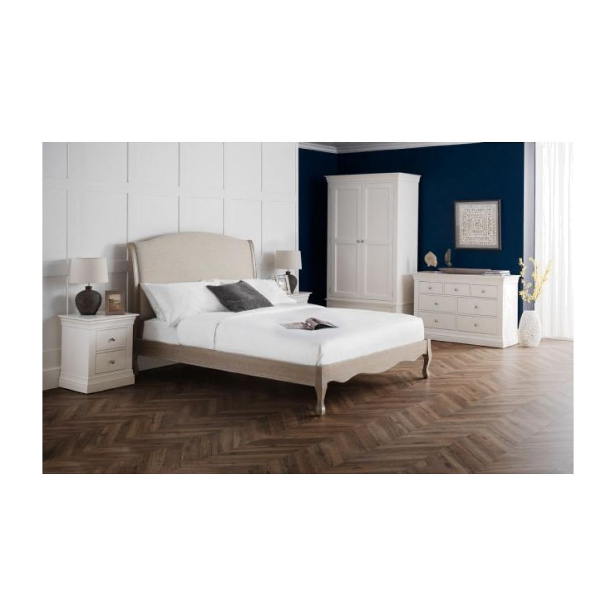 Inspired from a classic French design, the Camille bed excels in elegance. Featuring traditional ornate details, from the curved and arched headboard, to a scalloped footboard with cabriole legs, this bed is the definition of a timeless design. The frame is finished in a limed oak effect, with a soft upholstered headboard covered in an oatmeal linen fabric. The Camille Bed is available in 135cm Double, 150cm King, and 180cm Super King sizes. Features: Classic French design Traditional details, curved and arched headboard, scalloped footboard and cabriole legs Material: Limed oak frame with an upholstered oatmeal linen headboard Available in 135cm Double, 150cm King, and 180cm Super King sizes.