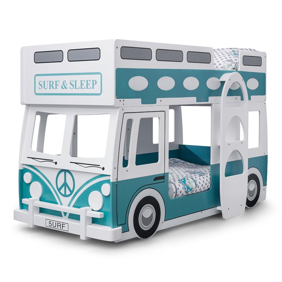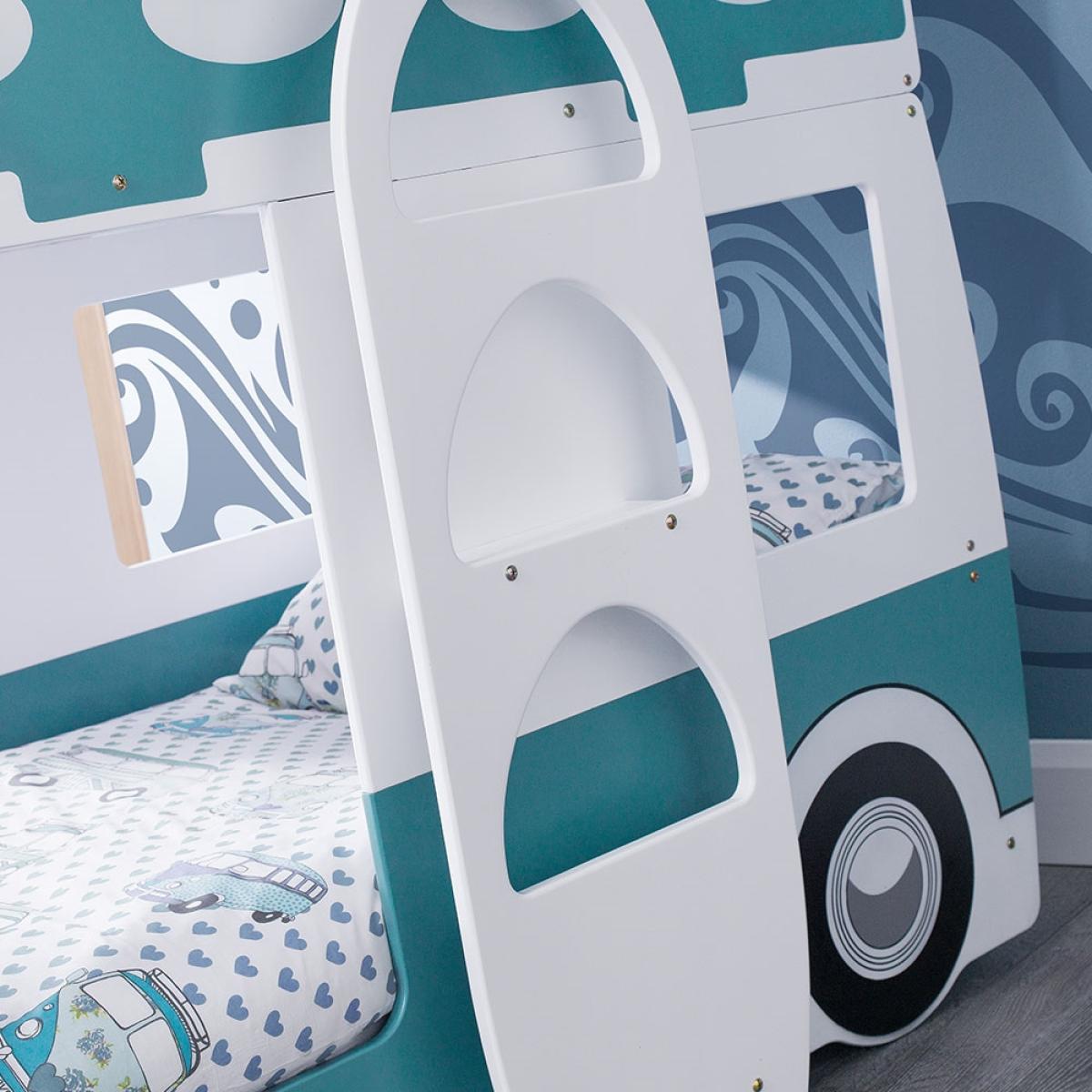 Give your little surfer dude or dudette a bed they will love with the Campervan Bunk Bed from Julian Bowen. It is sure to put a smile on their little faces and earn you some serious brownie points! Resembling a campervan, finished in white and teal, bedtime should be one easy task with your kiddies knowing this awaits them. Featuring a movable steering wheel and a ladder-shaped like a surfboard, your little ones will have a whale of a time imagining they're heading to the beach to catch some waves!.