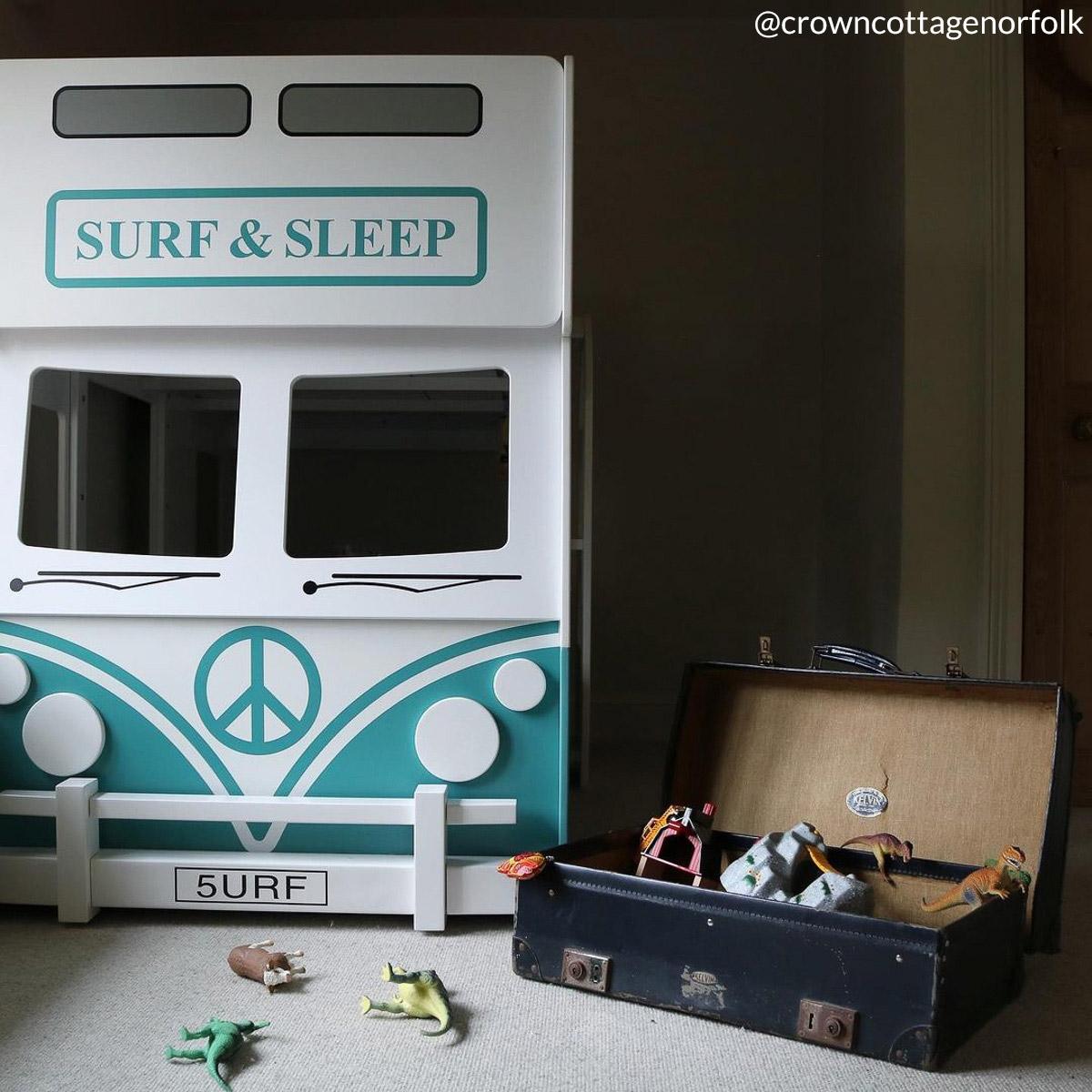 I love this campervan bunk bed for its fun, playful design that instantly brings a sense of adventure to a child's room. It works particularly well in interiors with a nautical, travel, or retro theme, adding character without overwhelming the space. For styling, consider keeping the colour scheme simple and pairing it with light, breezy tones to let the bed stand out as the focal point. Practical tips include using under-bed storage or hooks on the side for organising toys and accessories, and adding layered bedding in coordinating patterns or colours to soften the look. This piece really lends itself to creating a cosy, imaginative environment that kids will love.