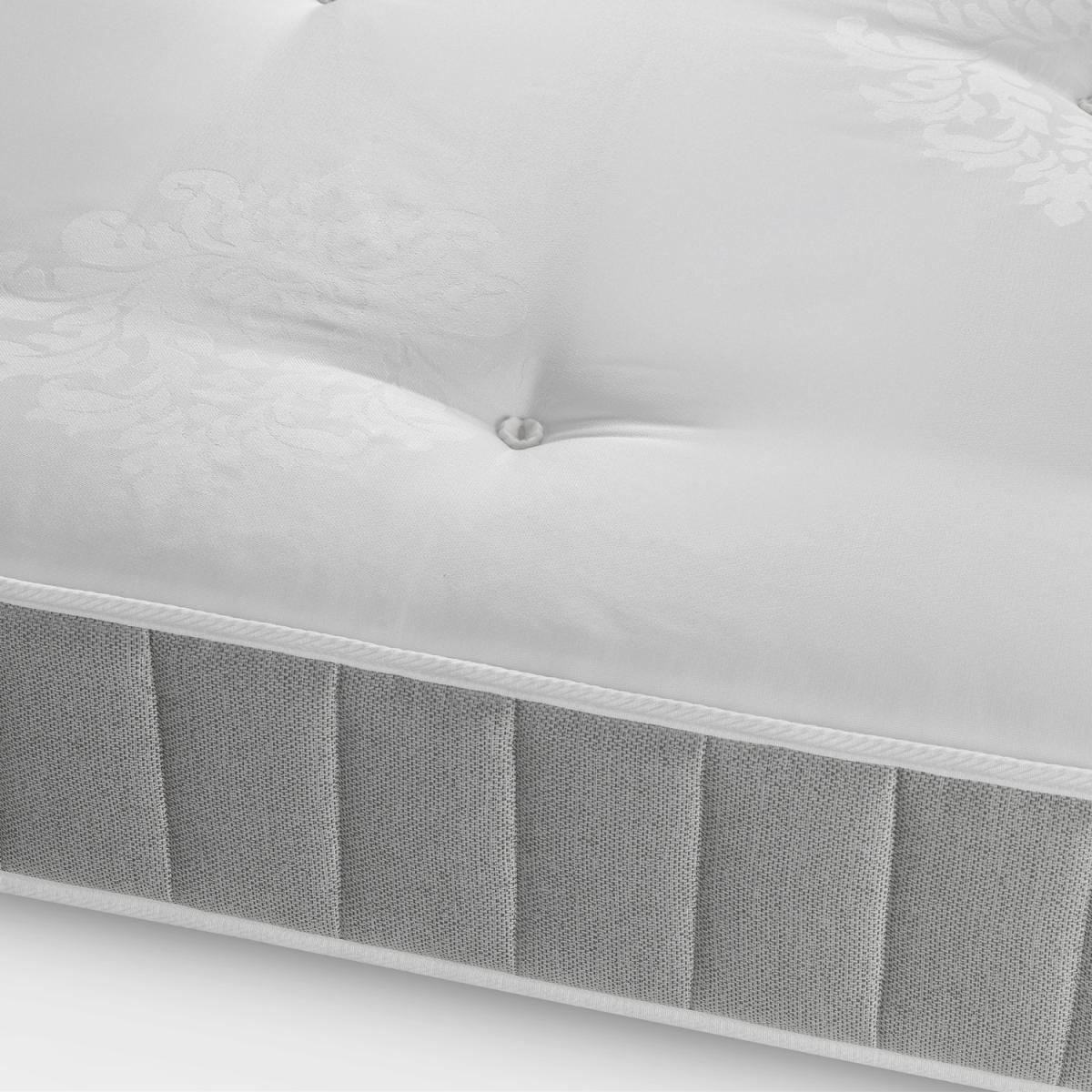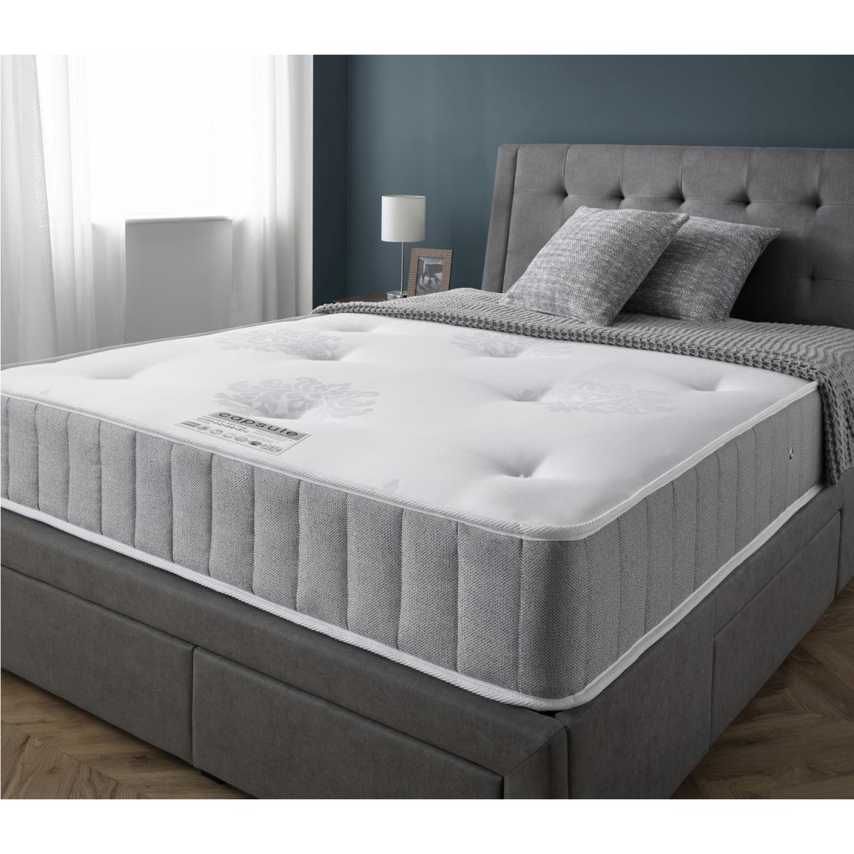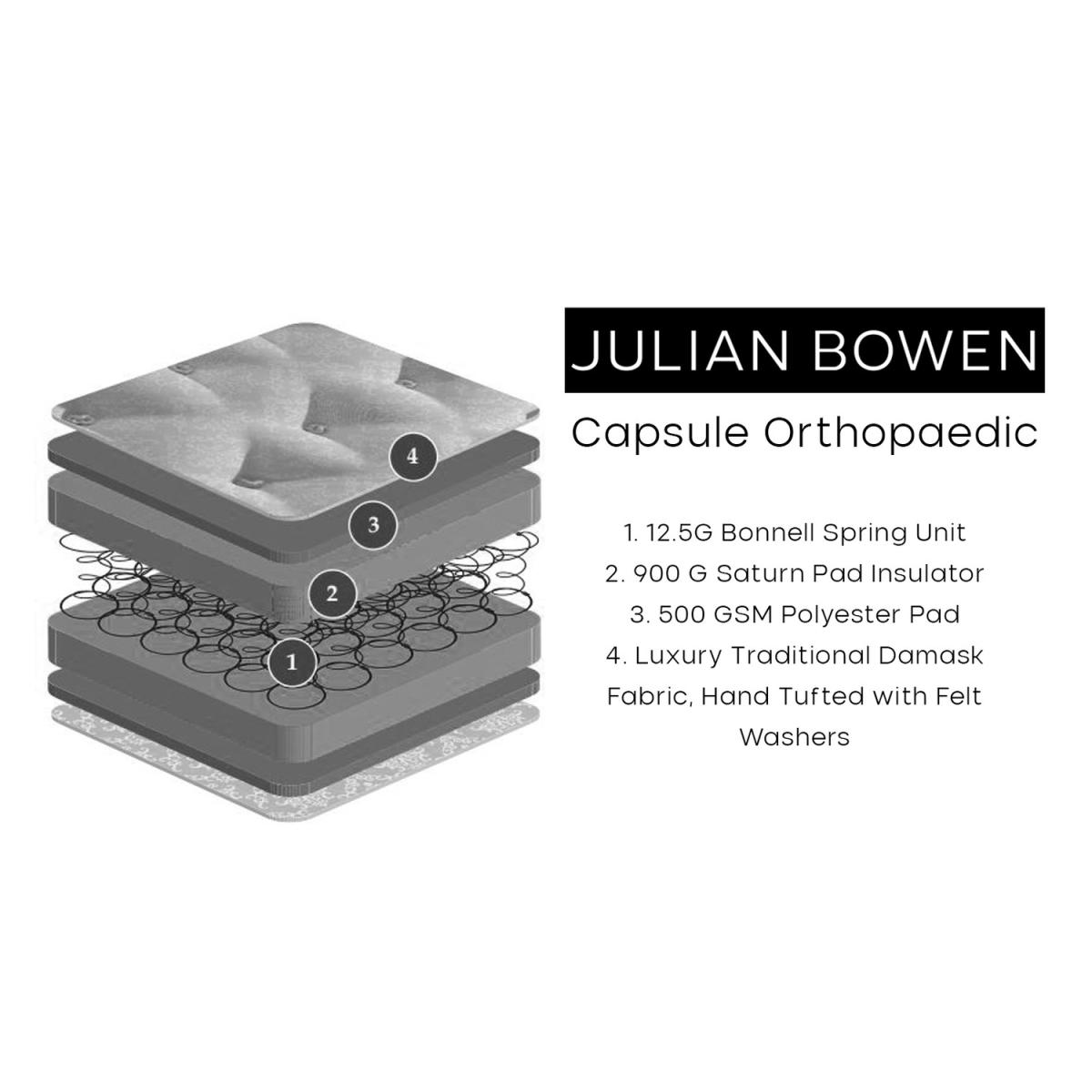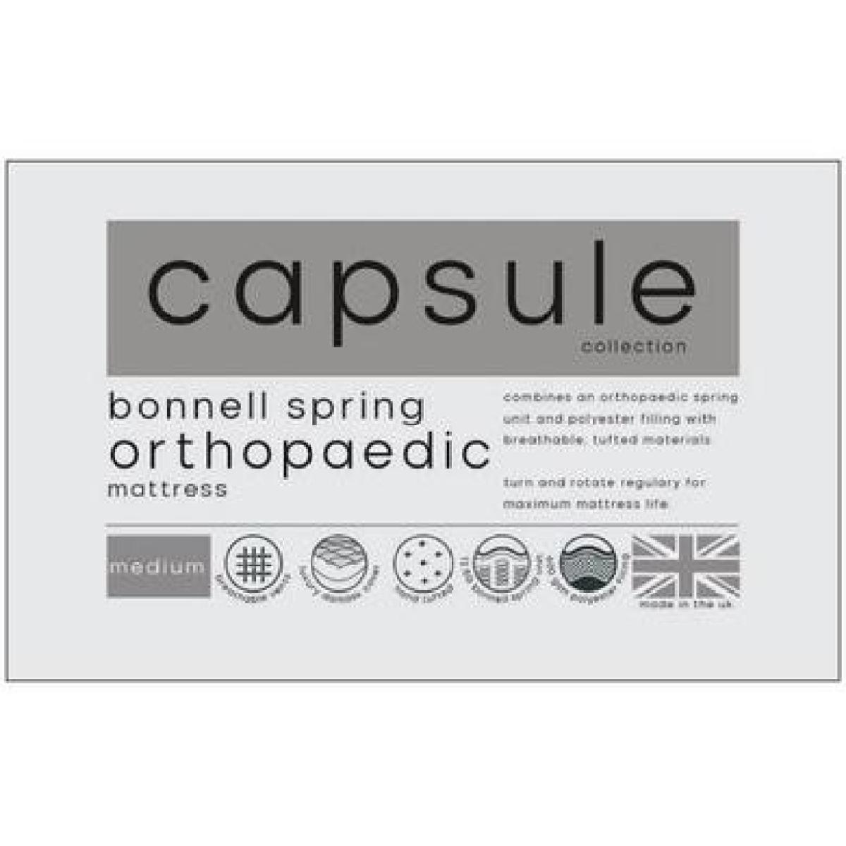 Coil Sprung Firmness Mattress Depth Orthopaedic Tufted 5 Year Warranty Made in UK Quilted Features we love Luxurious medium mattress with orthopaedic support Hand tufted with felt washers for comfort Bonnell springs for extra support Damask soft touch fabric top Orthopaedic qualities help to relieve aches and pains All about me Drift off to dreamland in ultimate comfort with this Julian Bowen orthopaedic mattress. Bonnell springs provide support for your back and body to keep you comfy all night long. The Capsule Orthopaedic Mattress offers a 12.5 gauge bonnell spring unit, with a 900gsm spring insulator pad and 500gsm polyester pad filling to help you get the best night's sleep. Finished in a soft touch Damask fabric with a feature contrast quilted border and hand tufted with felt washers, this mattress provides the best orthopaedic comfort level you need for a great night's sleep. Available in Single, Double and King sizes, this mattress is part of the Capsule Mattress Collection. ORTHOPAEDIC BACK SUPPORT | Hand tufted with felt washers, the Capsule Orthopaedic range provides firm yet comfortable support for your back and body – allowing you to get a much-needed relaxed night's sleep. HIGH-LEVEL CRAFTSMANSHIP | Mattresses made in the highest quality – finished in a Damask soft touch fabric and a contrasting quilted border, this mattress is long-lasting and luxurious, without compromising the high levels of comfort. QUICK & EASY SET UP | This mattress comes in easy-to-remove packaging and is not rolled – so there is no long wait. Simply place the mattress upon your bed frame, get your pyjamas on, and sleep easy. Need to know Dimensions:W135 x L190 x H21 cm Size: Double (4ft6) Firmness: Medium Type: 12.5-gauge Bonnell spring unit Filling: 900gsm spring insulator and 500gsm polyester pad Top: Hand tufted Made in the UK Tested to meet all UK quality and safety standards