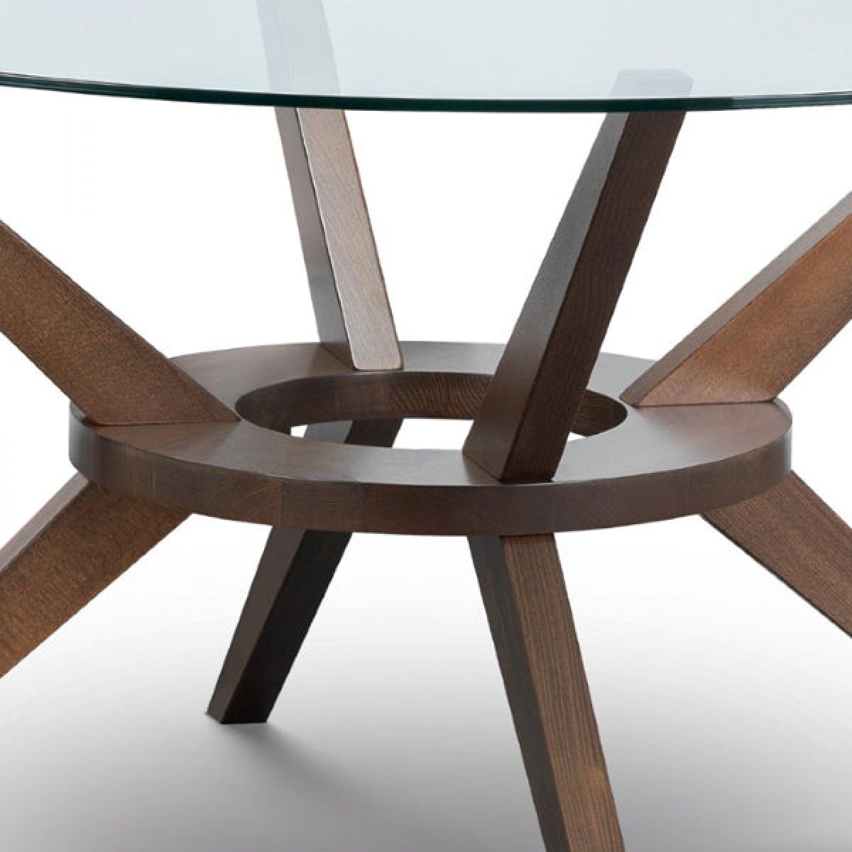 A truly stunning 120cm circular dining table featuring an elegantly styled solid wood base in walnut finish, topped with a substantial tempered glass top to create an exquisite contemporary piece that will take pride of place in any home. H: 75 x W: 140 x D: 140 cm.