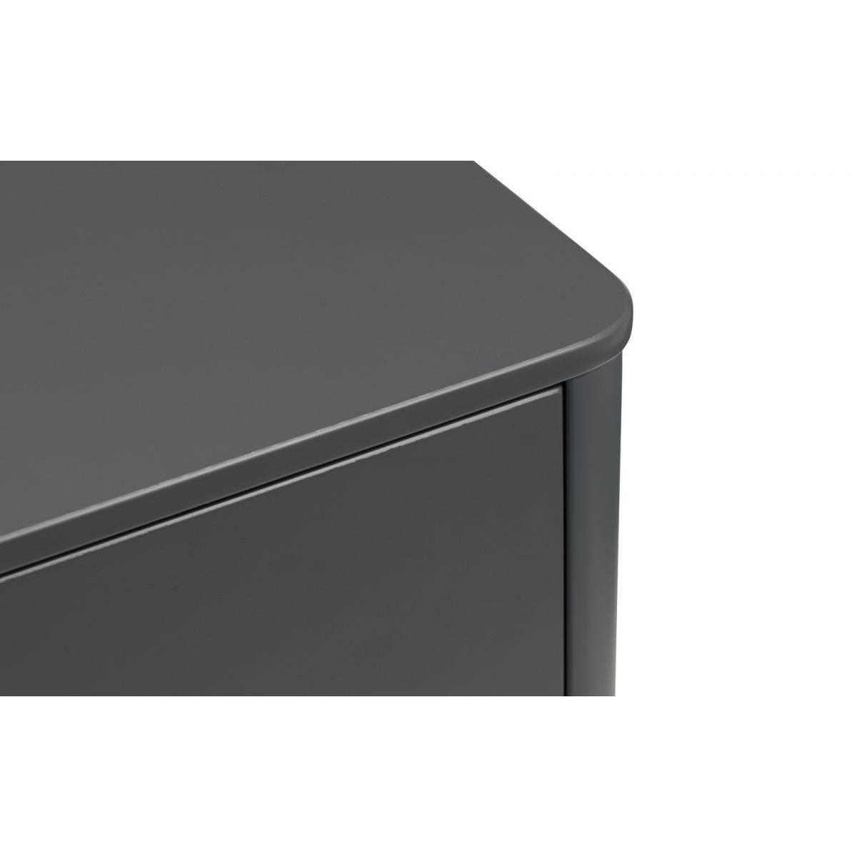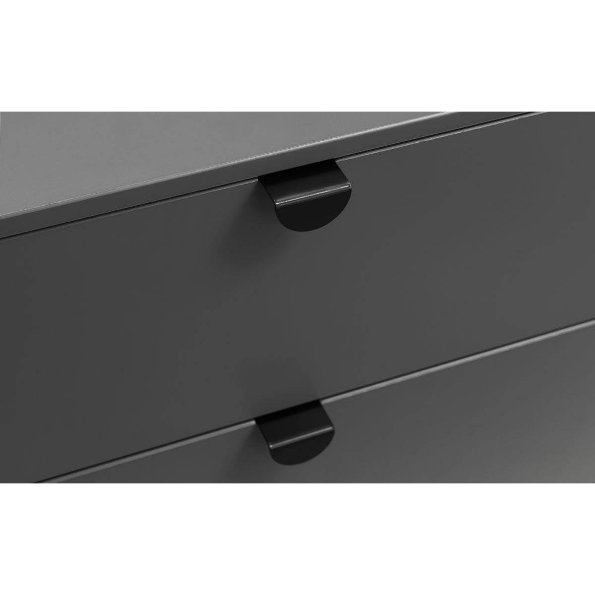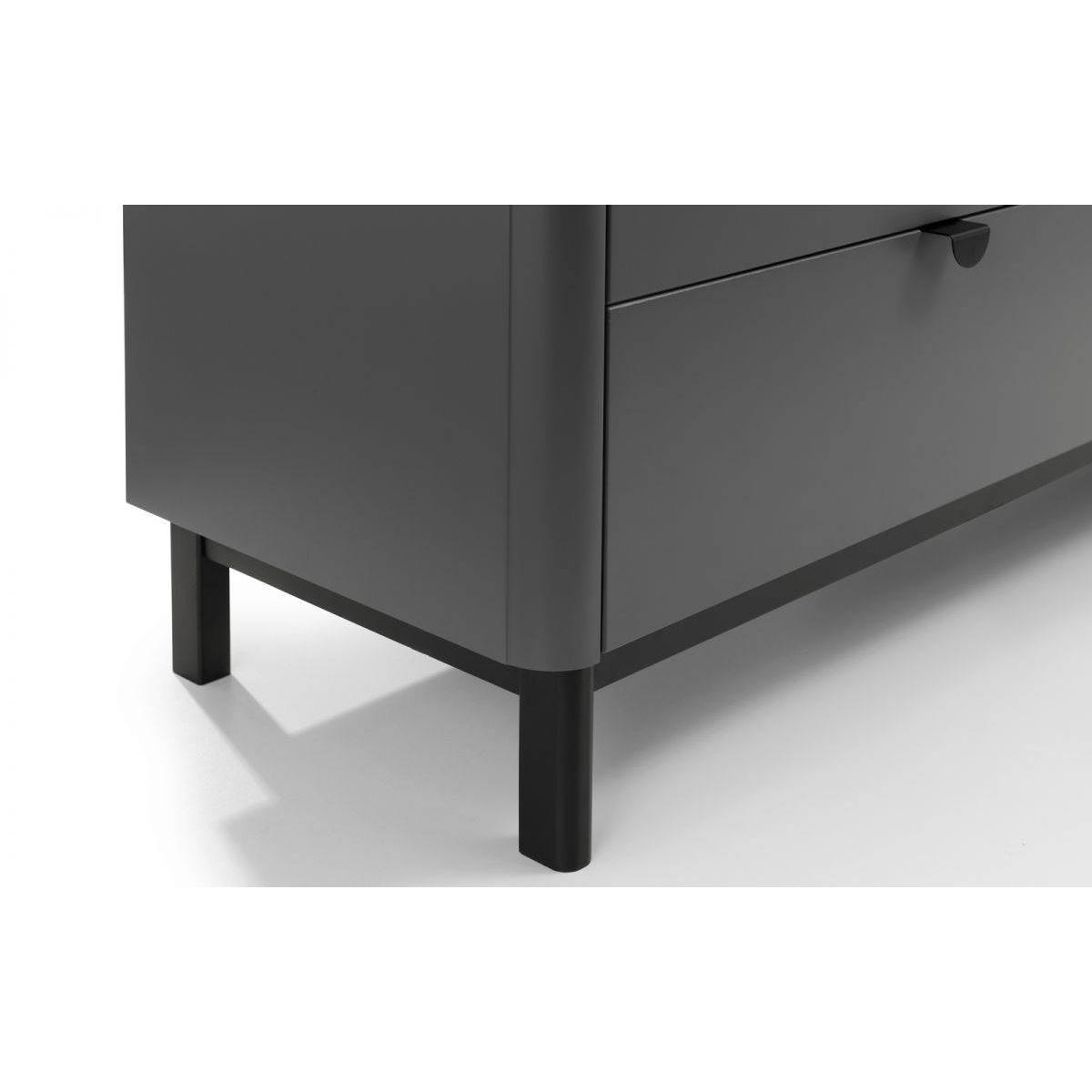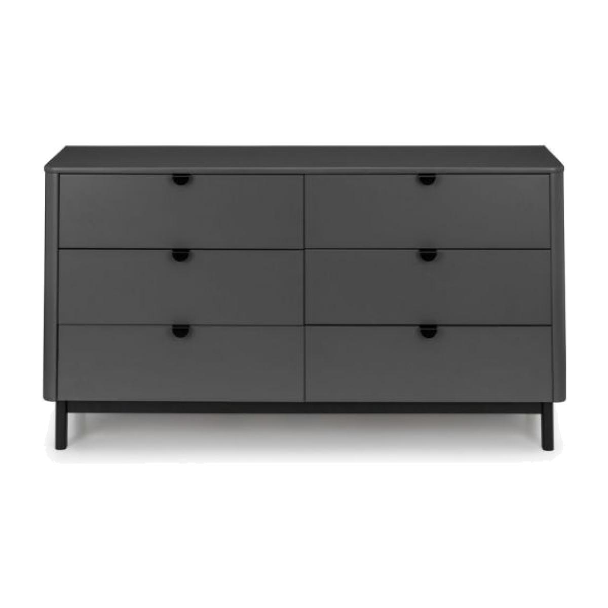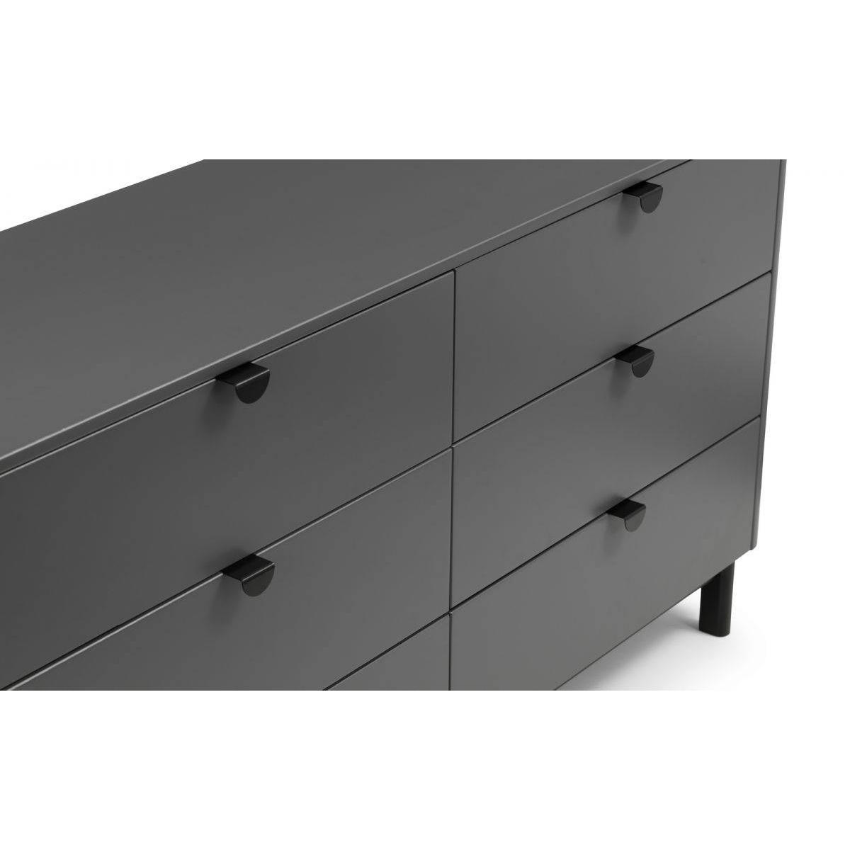 The Chloe Bedroom collection has a modern, retro style finished in a storm grey lacquer with satin black wooden legs and handles. The corners are rounded for a softer look, creating perfect balance between style and functionality. Featuring 6 large drawers, this chest is perfect for neatly storing your clothes. Dimensions: 40cm (D) x 140cm (W) x 90cm (H)Requires assembly.