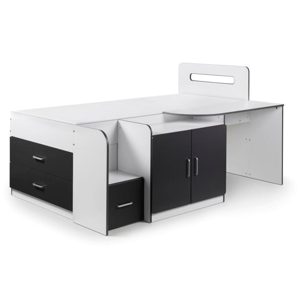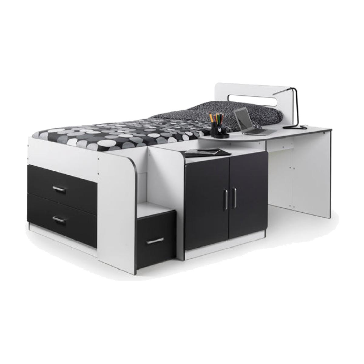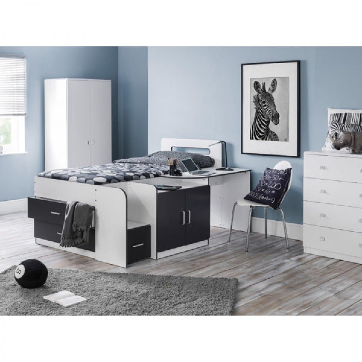 An innovative and highly functional cabin bed offering incredible versatility with three storage drawers, a cupboard, shelf and desk neatly integrated into a sharp, contemporary design. A sleek matt finish in white and charcoal grey makes the Cookie Cabin Bed the perfect combination of style and practicality for any children's or teenager's bedroom.