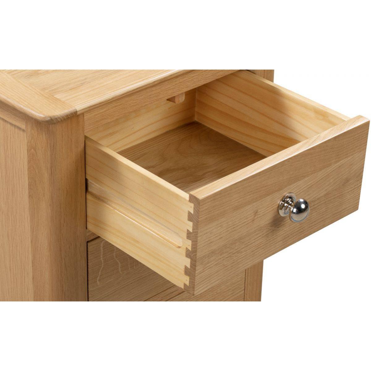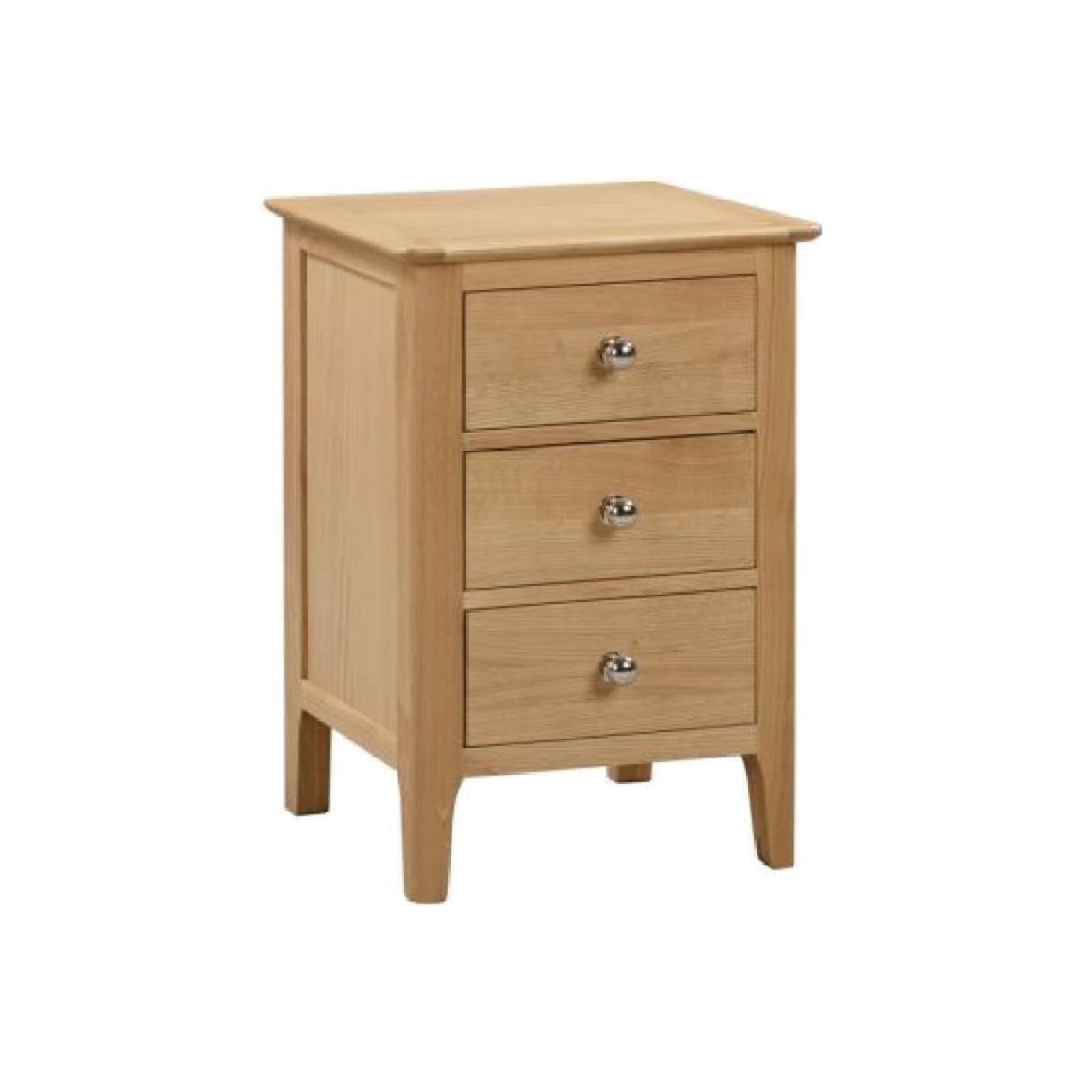 Crafted from solid oak and oak veneers, the Cotswold 3 Drawer Bedside ensures lasting durability with its robust structure. Featuring 3 spacious drawers, ideal for keeping night-time necessities within arm's reach, with additional space on top for a bedside lamp. This simple, yet elegant design is finished with a round silver knob, perfect for any traditional bedroom. Dimensions: 38cm (D) x 45cm (W) x 65cm (H)Requires assembly.
