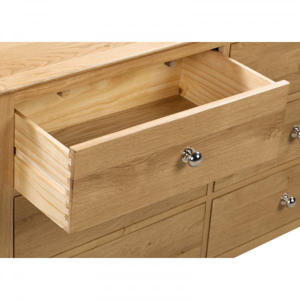 Crafted from solid oak and oak veneers, the Cotswold 6 Drawer Wide Chest ensures lasting durability with its robust structure. Featuring six large deep drawers, providing copious amounts of space to organise your belongings. This simple, yet elegant design is finished with a round silver knob, perfect for any traditional bedroom. H: 75 W: 150 D: 40 cm.