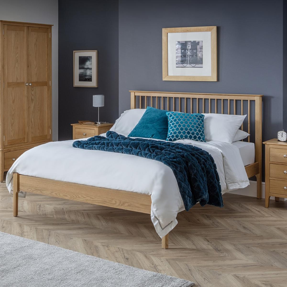Sweet dreams won't be far away with the Cotswold Bed from Julian Bowen. This design classic will be the finishing touch to your bedroom. It's beautifully crafted oak spindle headboard and elegantly shaped legs will add a timeless elegance to your room. It will be the perfect spot to spend lazy Sunday mornings with a delicious flaky pastry and a cup of coffee in hand. Just try not to get crumbs in the duvet!.