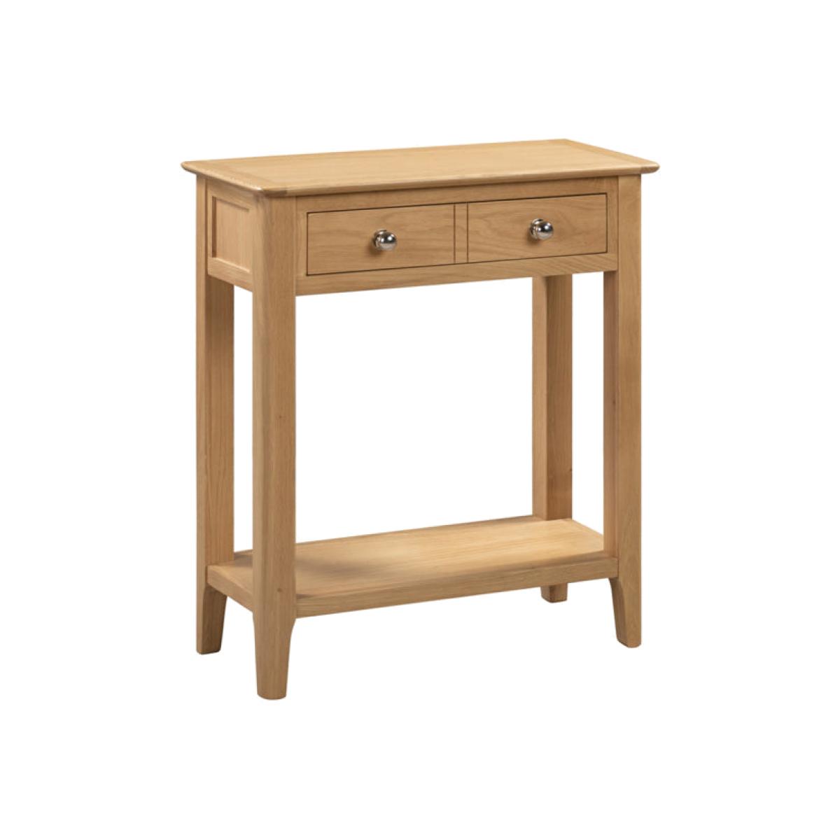 Crafted from solid oak and oak veneers, the Cotswold Console Table features 2 Drawers and a spacious shelf for storing your keys or winter warmers. This simple, yet stylish design is an ideal additional to any traditional living room with its soft edges and charming round silver knobs. Part of the Julian Bowen Cotswold Dining & Occasional Collection.