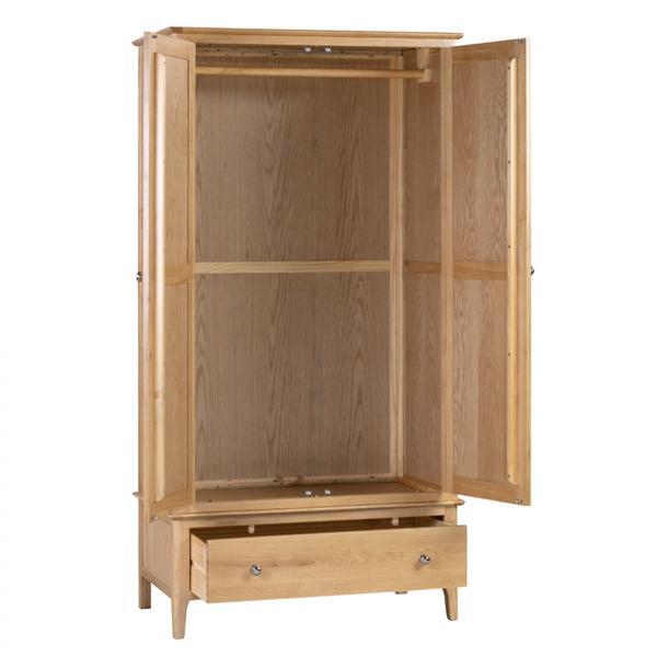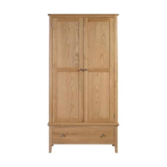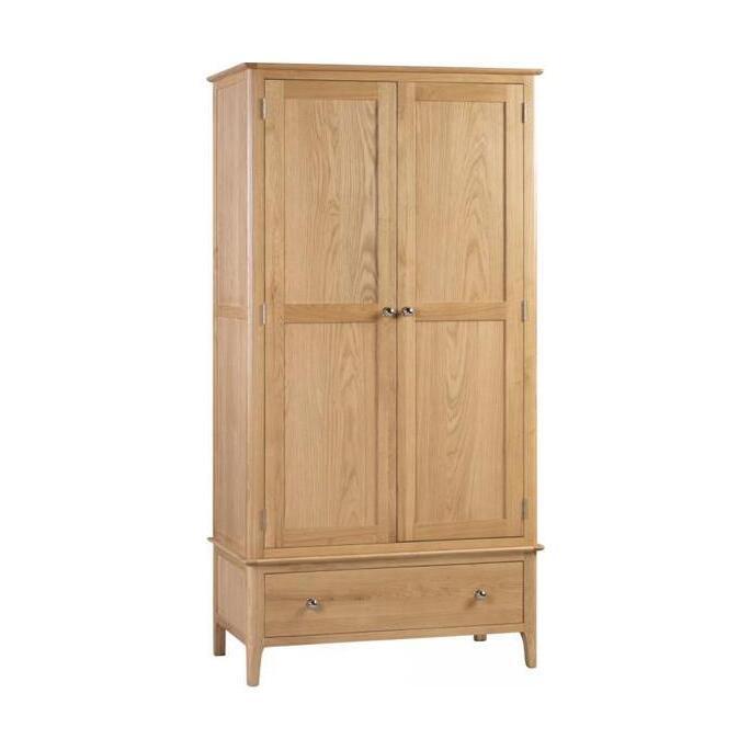 Crafted from solid oak, the Cotswold 2 Door 1 Drawer Wardrobe ensures lasting durability with its robust structure. With a spacious double door design, this wardrobe provides plenty of hanging space to store your clothing. Featuring an additional drawer for extra storage. This simple, yet elegant design is finished with a round silver knob, perfect for any traditional bedroom.
