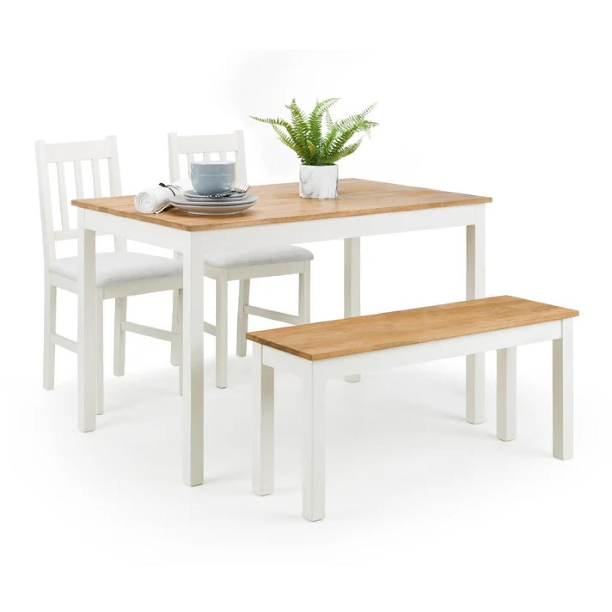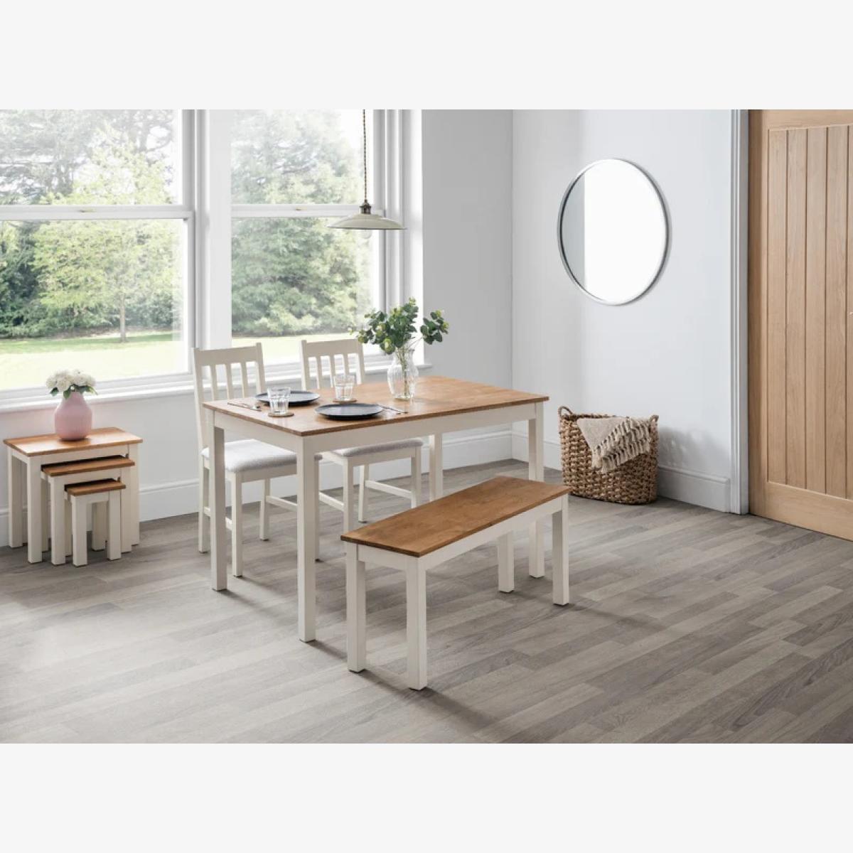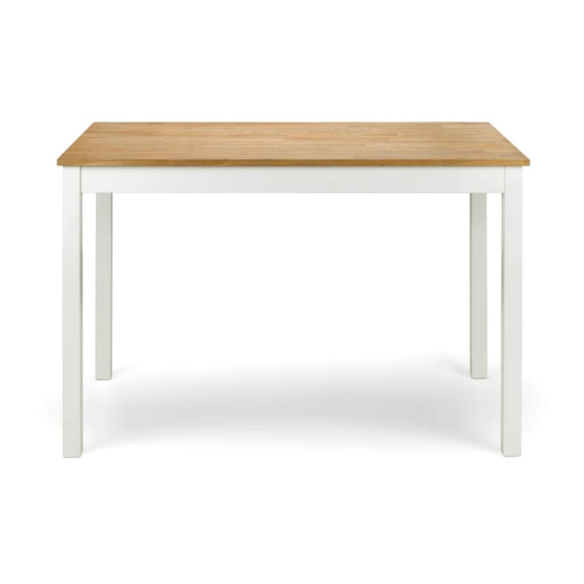 Beautifully crafted from solid white oak with a warm oiled finish, the Julian Bowen Coxmoor Dining Table in an elegant ivory and oak combination brings a classic, homely feel to any kitchen or dining room. The natural grain of the wood is richly enhanced for a look that’s both traditional and full of character – a real conversation starter for when friends and family gather round. Built to Last, Made to Impress With its sturdy rectangular frame and clean-lined design, this table strikes the perfect balance between rustic charm and everyday practicality. Whether you’re enjoying a relaxed breakfast or hosting Sunday lunch, it offers a dependable and stylish setting for every meal. Simple to Care For Thanks to its smooth, oiled finish, the Coxmoor is a breeze to keep clean – a quick wipe-down is all it takes to keep it looking its best. The durable surface stands up well to the rigours of daily life, making it a truly family-friendly choice. Versatile Style for Any Setting Its neutral ivory base paired with natural oak tones means it fits seamlessly with a wide range of décor styles – from countryside cottages to contemporary townhouses. Features: Crafted from solid white oak with an oiled finish to showcase the grain Ivory-painted base adds a light, airy touch to any room Smooth, easy-clean surface resists everyday wear Comfortably seats 4–6, ideal for family meals or casual entertaining Minimal assembly required – easy to put together and enjoy Dimensions: 150cm (L) x 90cm (W) x 75cm (H) Please note All screens vary in colour reproduction and whilst every effort has been made to display the colour as accurately as possible it is for guidance only.